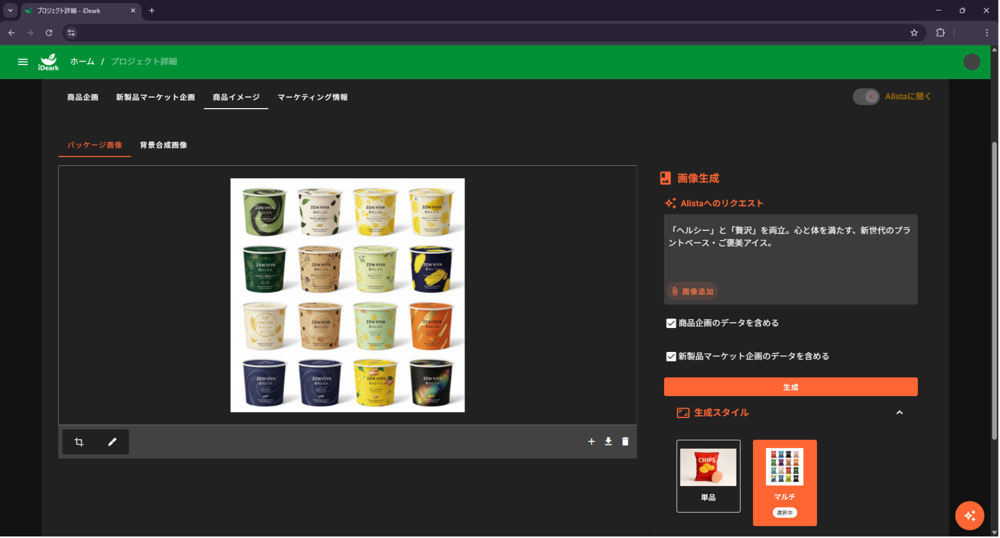 iDearkは、社内に保管されている紙やデータの資料、最新の市場調査データをシステムに集約し、食専門AIエージェント「ALISTA(アリスタ)」が伴走することで、企画から開発に至るプロセスの効率化を実現します。