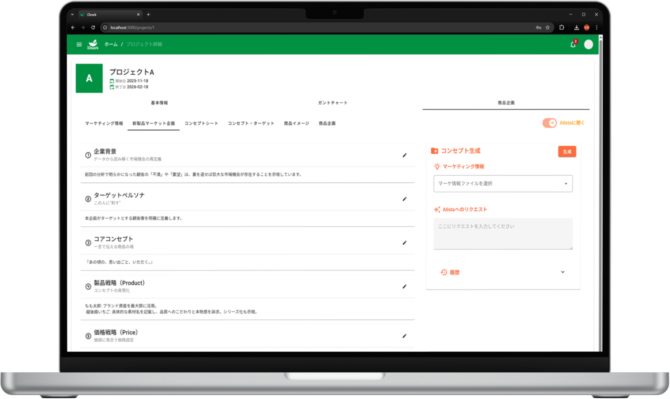 ALISTAは、iDearkに付随する食品領域に特化したAIエージェントです。iDearkにて実施する商品開発の検討プロセスに伴走し、以下の機能を提供します。