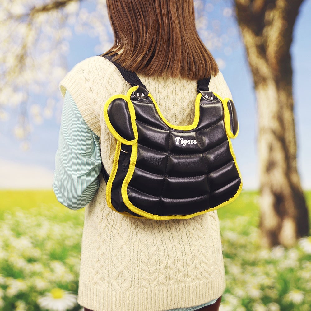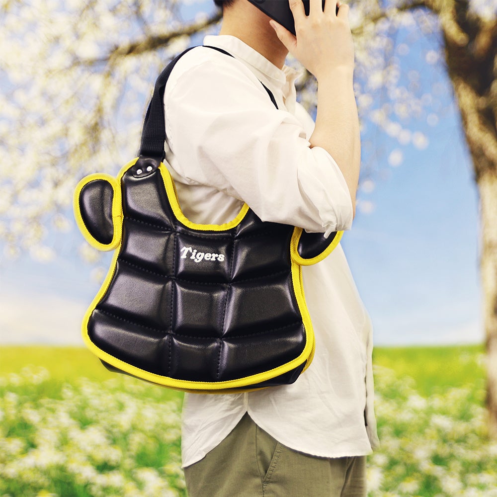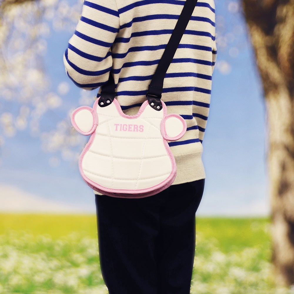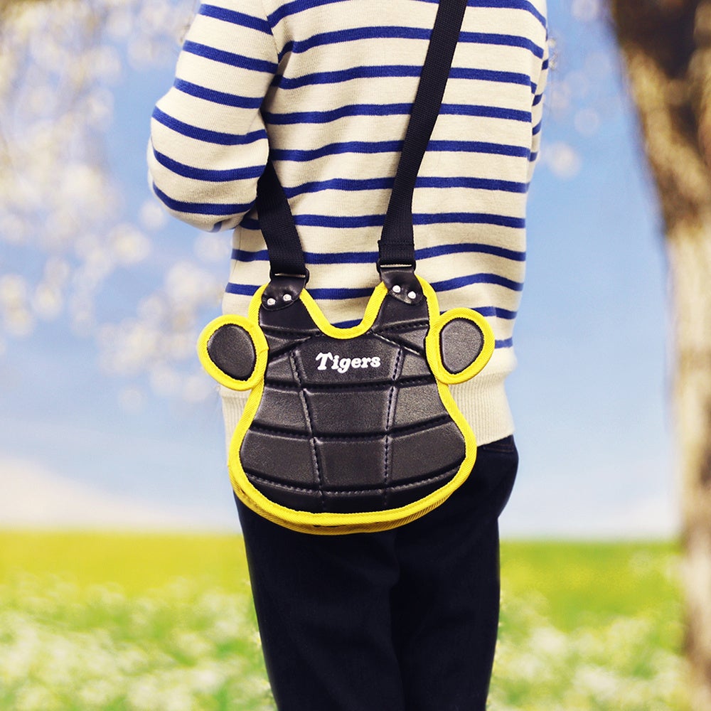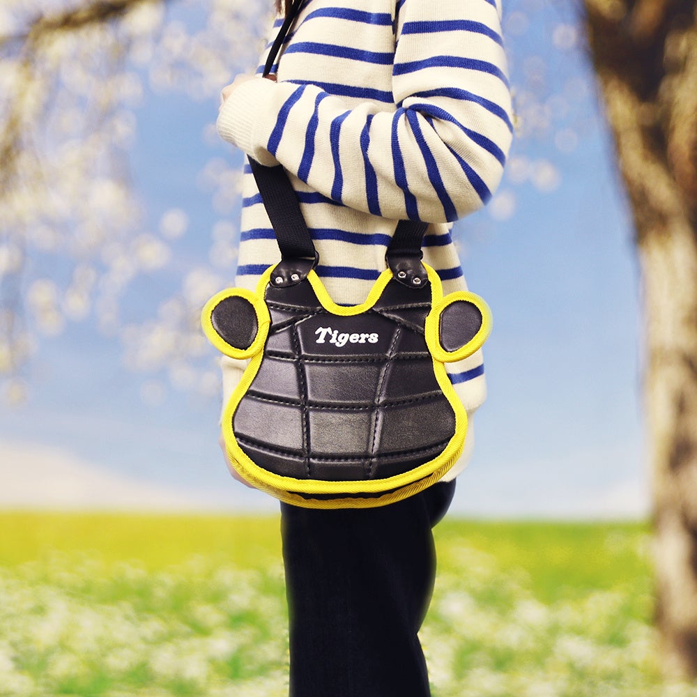 阪神タイガースのチームカラーが目を引く、キャッチャーのプロテクターをあしらったサコッシュです。プロ選手も使用する素材で作られているため、かわいい見た目とは裏腹に球場での存在感は抜群です。