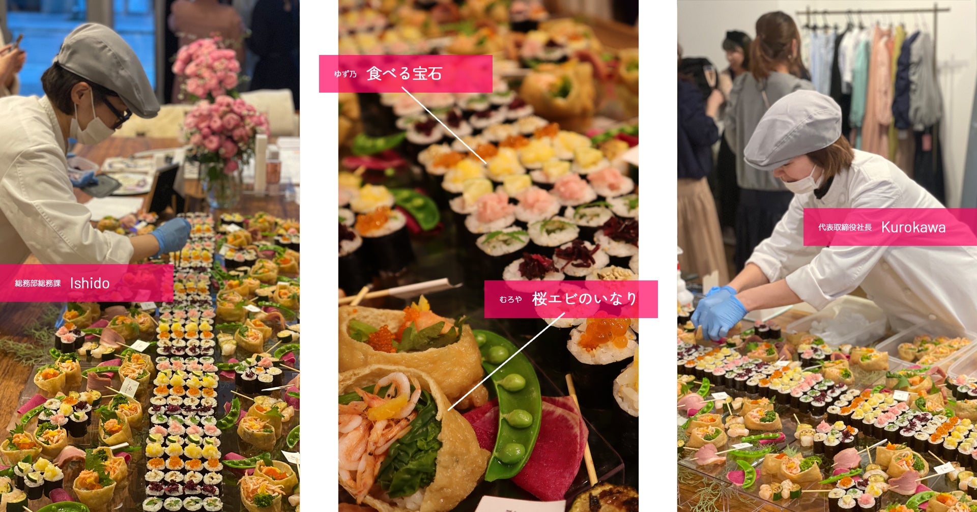 弊社デザインケータリング【WaBiE】の魅力は、美味しさだけではありません。会場を彩る色鮮やかなお料理の演出にも、弊社の細かなこだわりが隠されています。今回のご依頼には、デザインケータリングのトータルデザインを担当した、弊社代表取締役社長の黒川を中心に、総務部もワクワクしながら、弊社ブランド【ゆず乃】の人気細巻き「食べる宝石」の飾り付けを行いました。