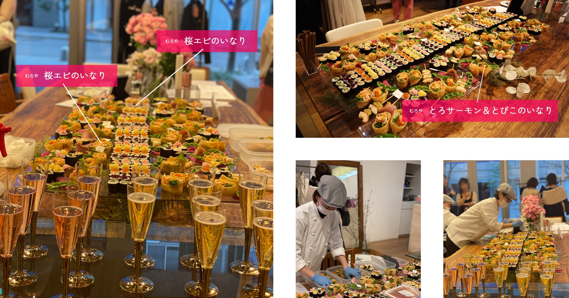 アパレルブランドのイメージカラーである「ピンク」を取り入れた"ゆず乃"の「食べる宝石」を中心に、周りに"むろや"のオープンいなりを春らしく「桜エビ」の淡い可愛らしいピンクに仕上げその間には、アパレルブランドロゴのピンチョスフラッグを飾った見た目にも楽しむことができる、まさに「食を通じて世界中の人々を笑顔に」する思わず微笑んでしまうデザインケータリングが完成しました。