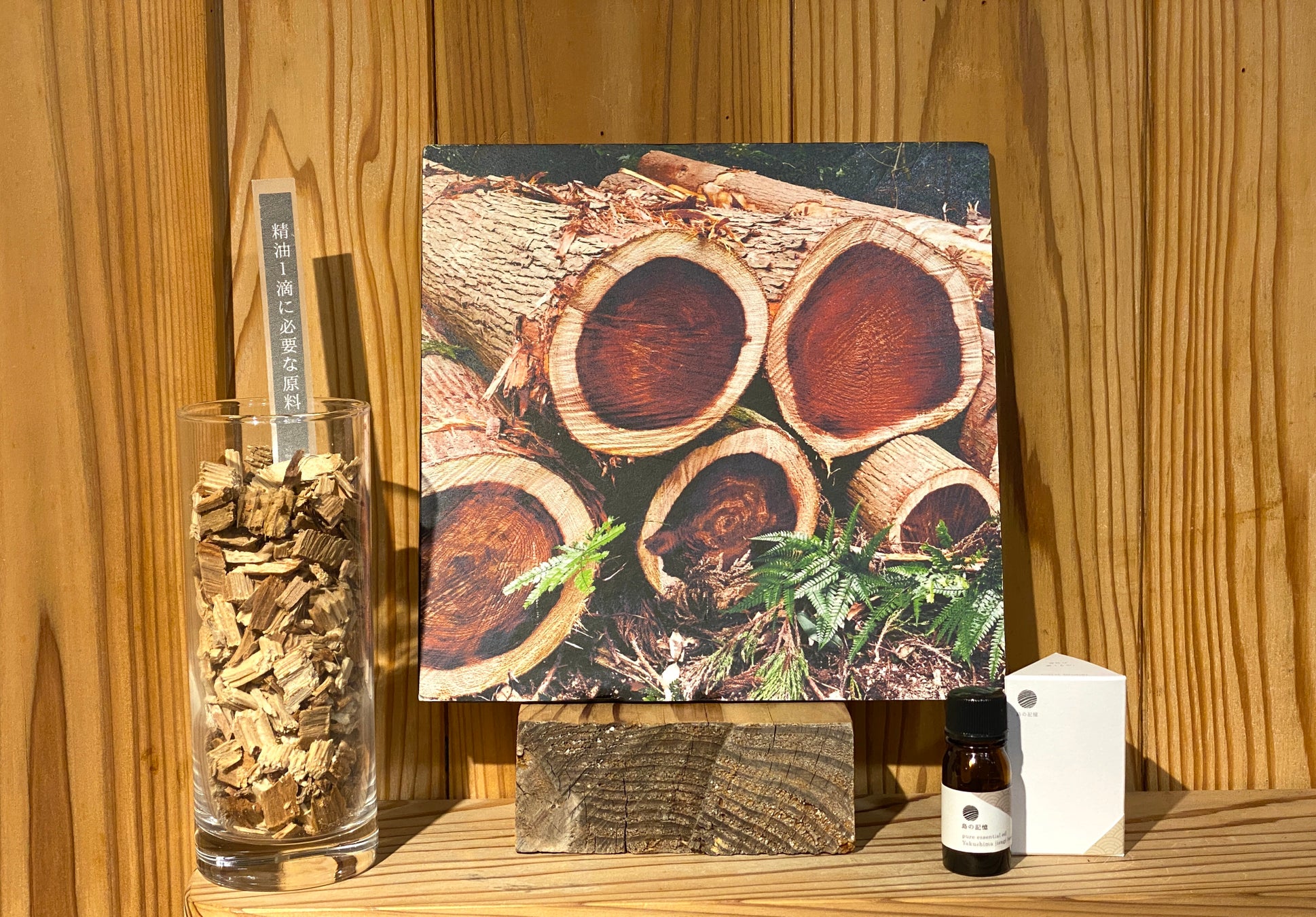 ・間伐材の中で建築などでは使われない端の部分をアップサイクルしている。1滴の精油抽出に対して500倍の木材が必要となる。