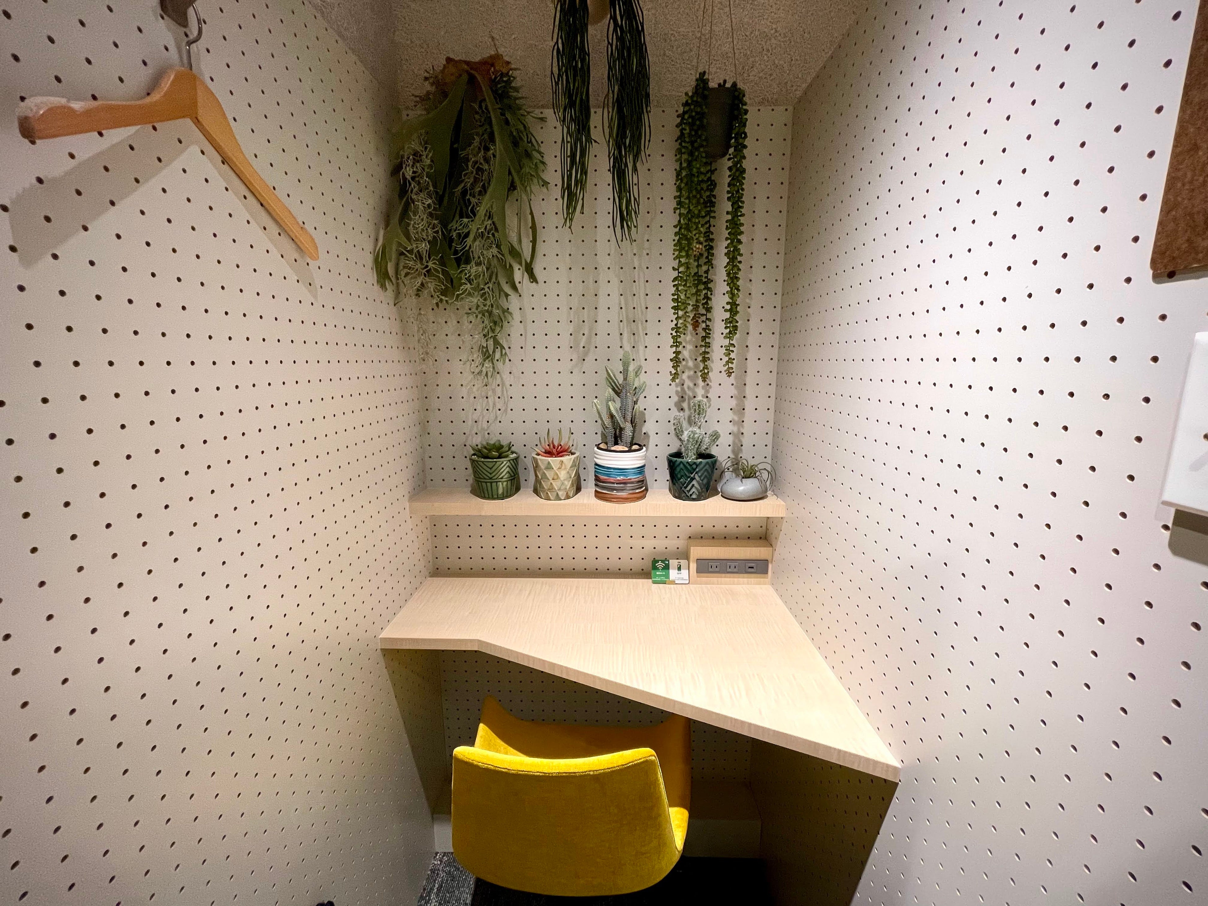 ブース内にはハンガーやちょっとした荷物を掛けられるフック、折り畳み式の荷物置きを設置。快適に過ごせる個室空間です。