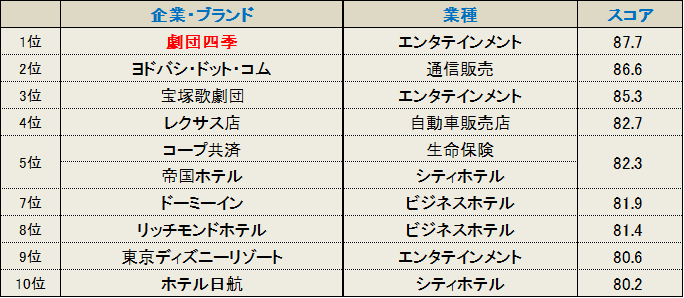 劇団四季が年間総合1位調査開始以来、14年連続業種別1位は4社