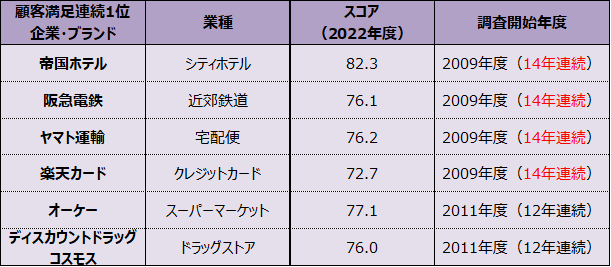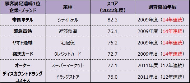 当該企業・ブランドが、ランキング対象となって以降、顧客満足が長期(10年以上)にわたり連続1位となっている企業・ブランドは以下の通りです。