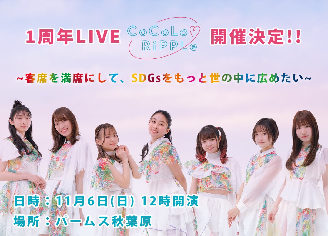 さらに、この日の15時からは、クラウドファンディングもスタートします。プロジェクト名は『SDGsアイドル「ココロリップル」1周年単独ライブ&SDGs活動応援プロジェクト』。11月6日(日)にパームス秋葉原で開催する結成1周年ライブを成功させると同時に、今後のSDGs活動をパワーアップさせるための資金を募ります。