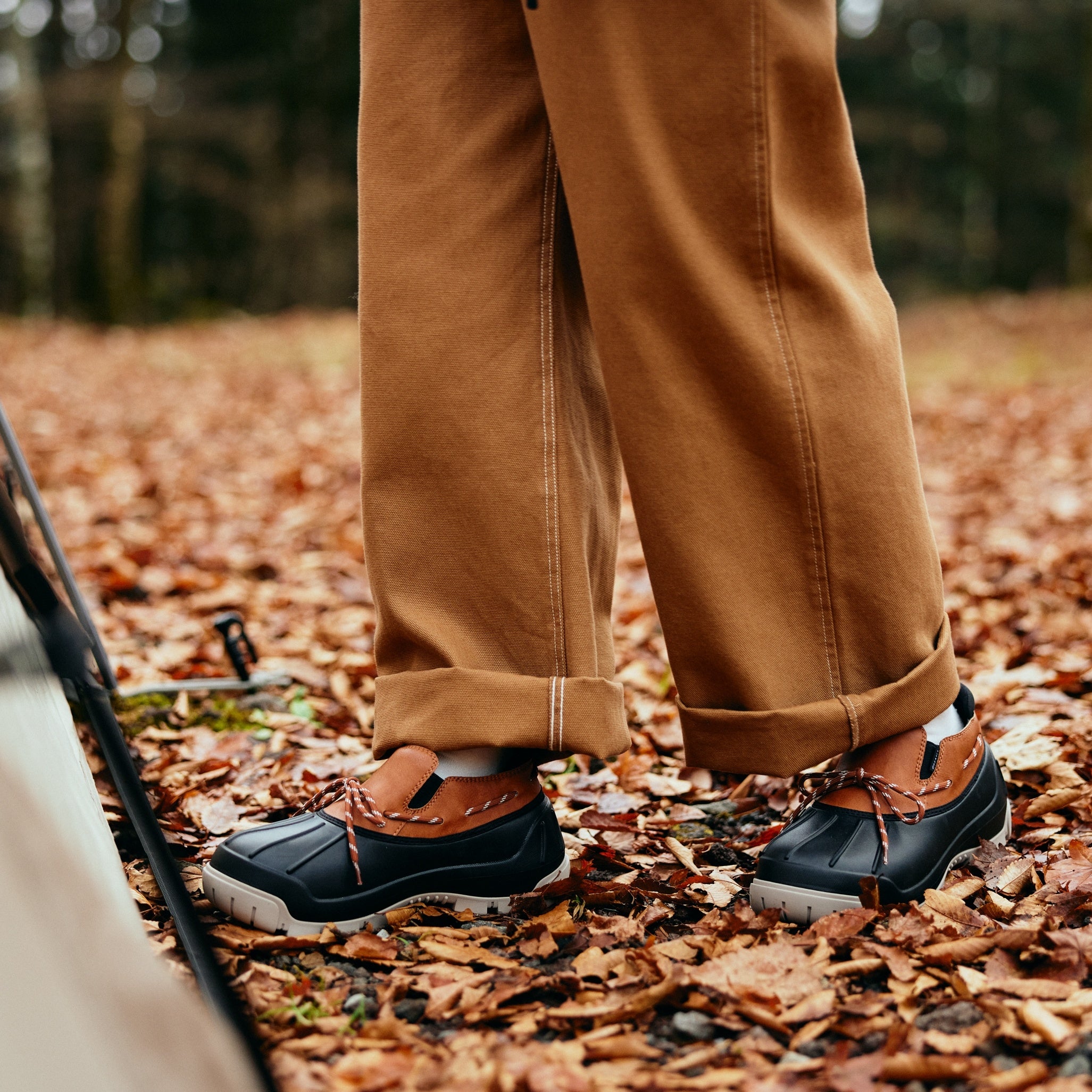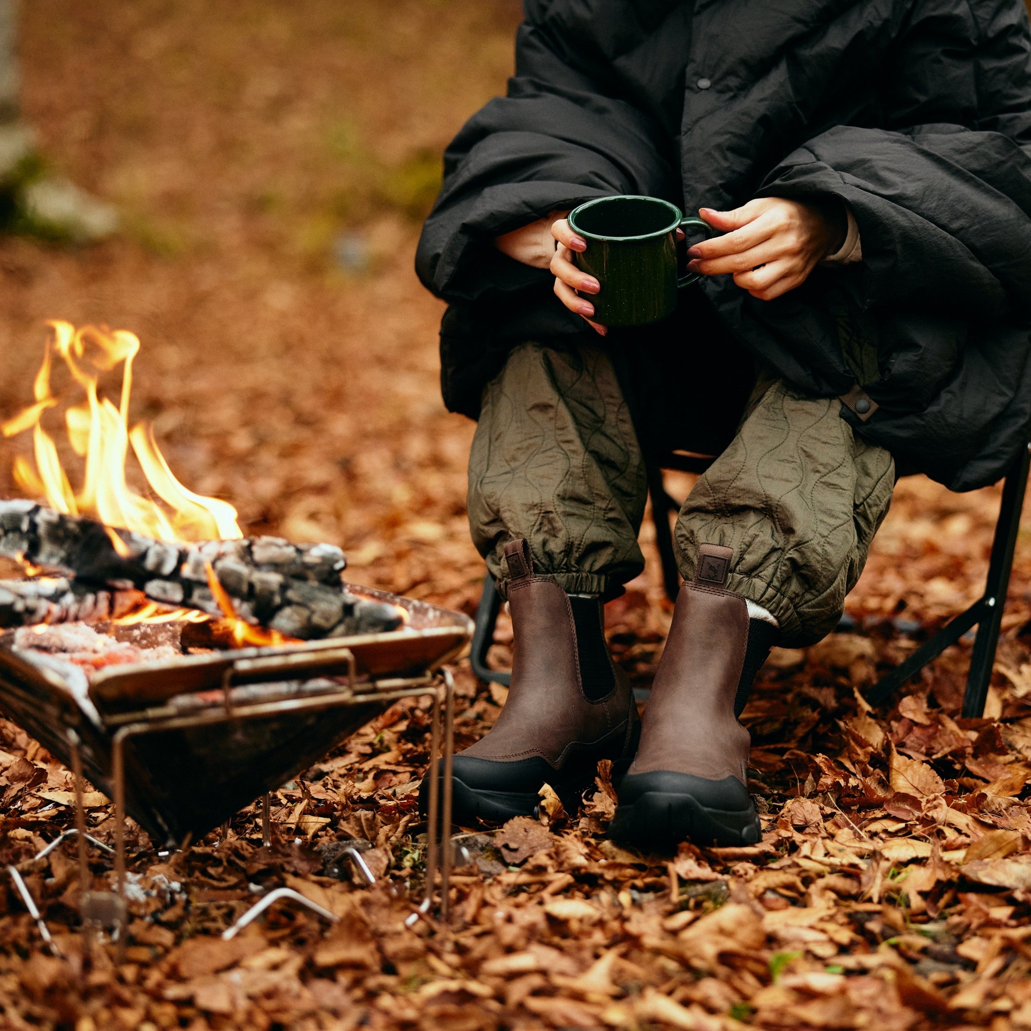 アッパーに難燃加工のFLAME STOPPER と、撥水加工の3M Scotchgard® を施したエコレザーを使用し、火の元でも安心のスペック。デザインの要となるフロントファスナーにはYKK AquaGuard® 止水ファスナーを採用。インソールは抗菌・防臭効果、通気性、クッション性の高いSHAKA IN-FOAM。