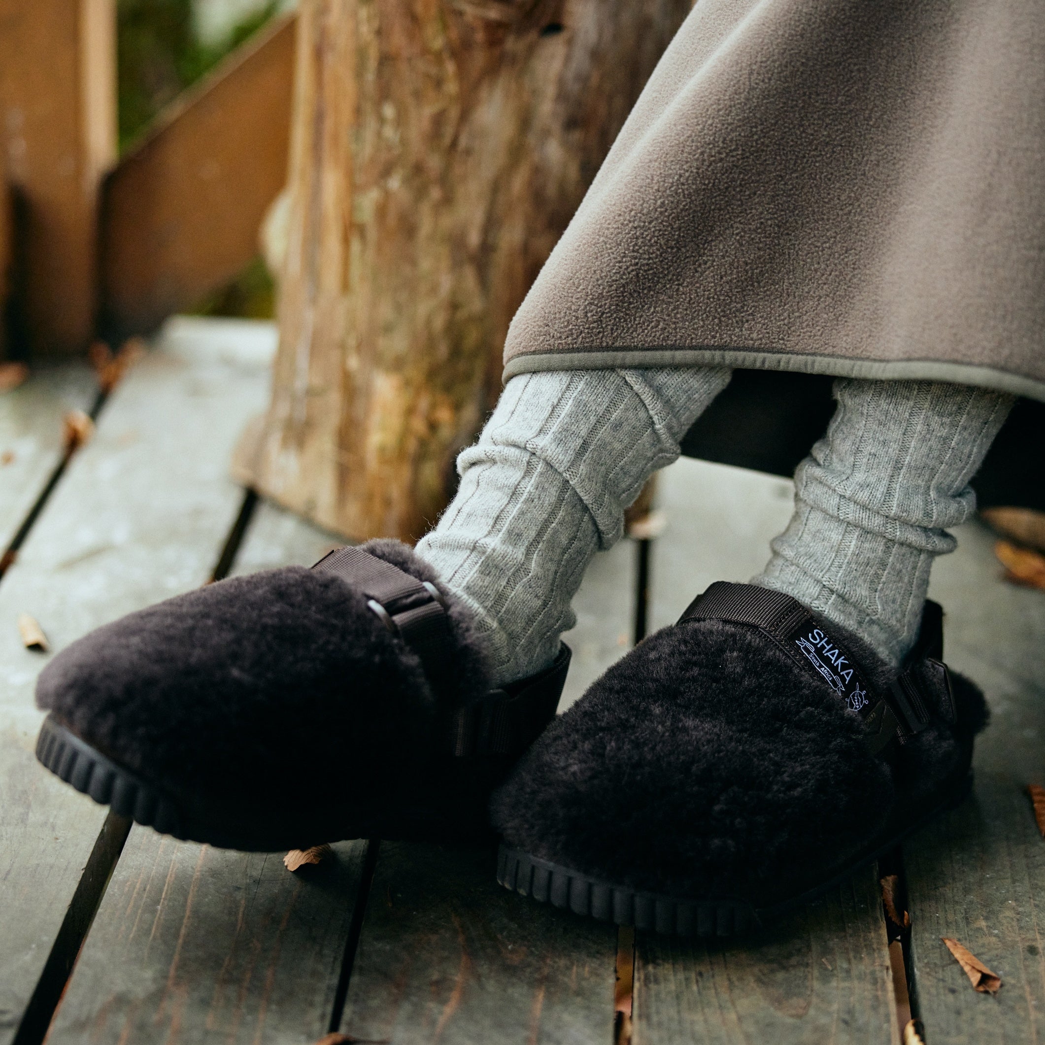 アッパーとフットベッドに高い保温性と吸水透湿性、優しい肌触りで手入れのしやすい、リアルムートンを使用。ソールはSHAKA を象徴するSHARK TOOTH GRIPパターンのORIGINAL SOLE。かかとのストラップは取り外し可能な2WAY仕様。