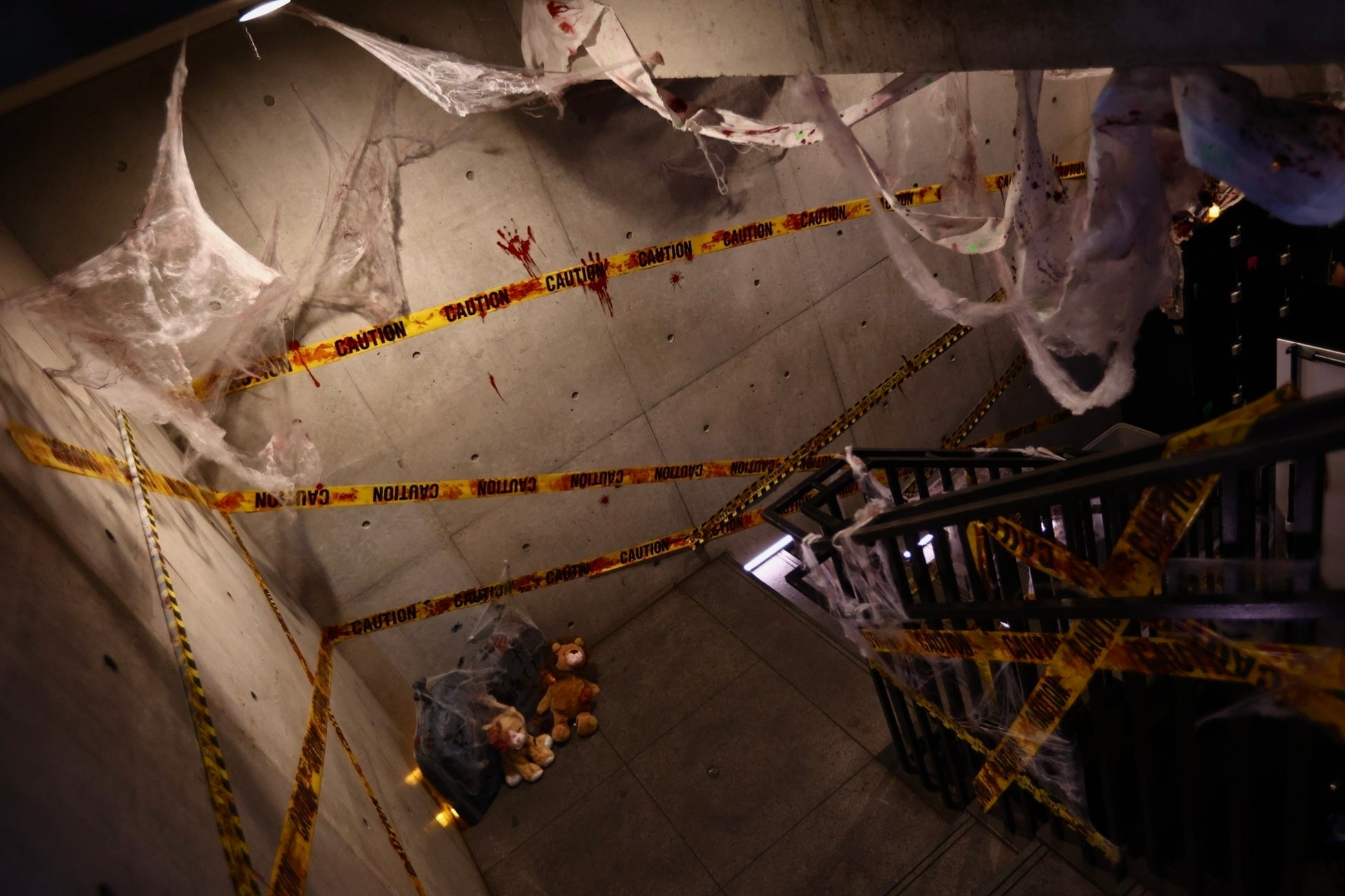 メインフロアには、ぎょろっと光る目玉やガイコツたちの姿が…!細かい部分の装飾にもこだわり、トイレやロッカーでも楽しめる空間作りを目指しました。