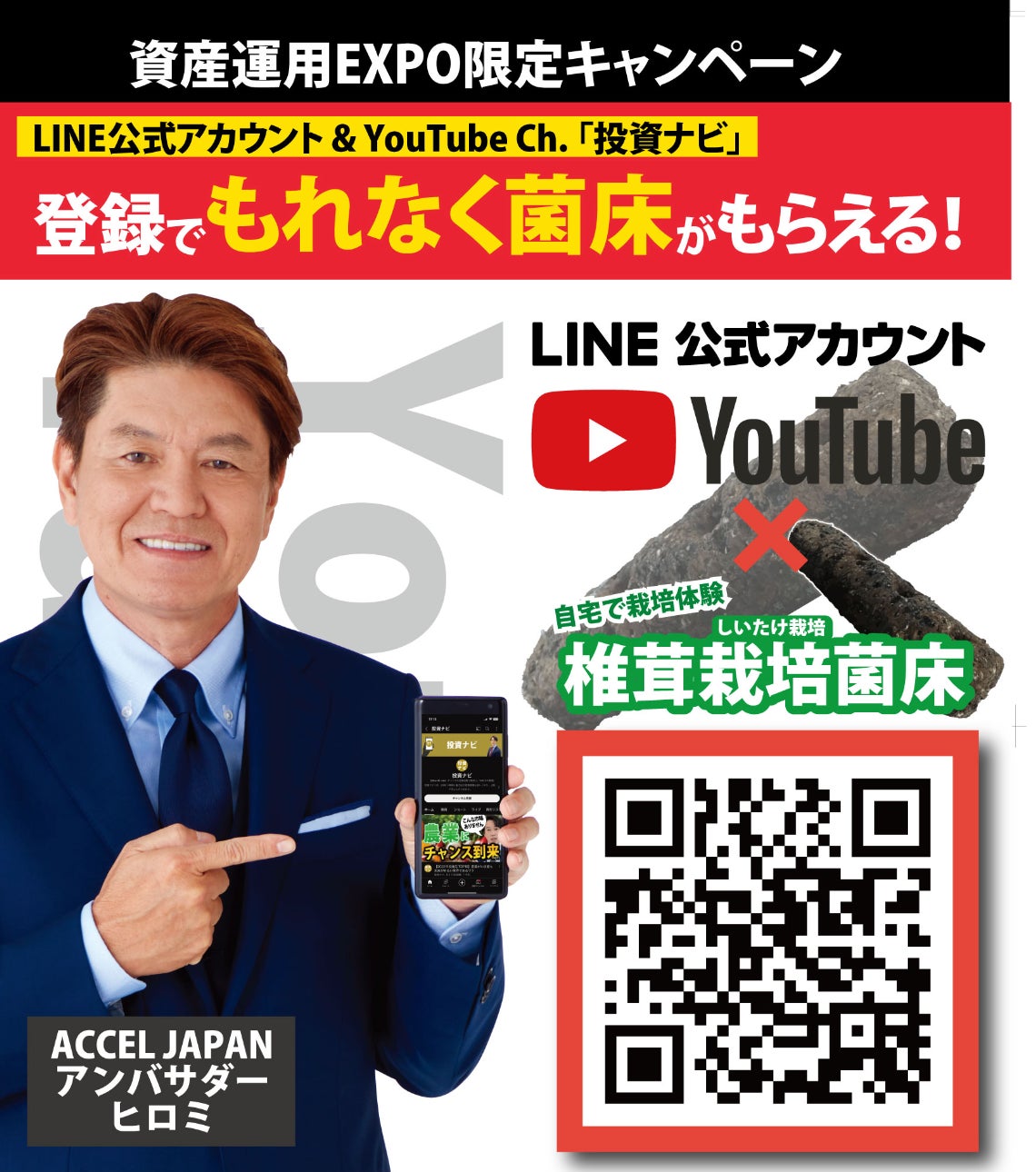 当日ブースにて、LINE公式アカウント「投資ナビ」(https://lin.ee/sWftuaP)とYouTubeチャンネル「投資ナビ」(https://www.youtube.com/channel/UCsQh7TrUx5ppG-p6WkdkKVA)に登録していただいた方にはもれなく、自宅で手軽にしいたけが栽培できる、椎茸菌床栽培キットをプレゼントいたします。