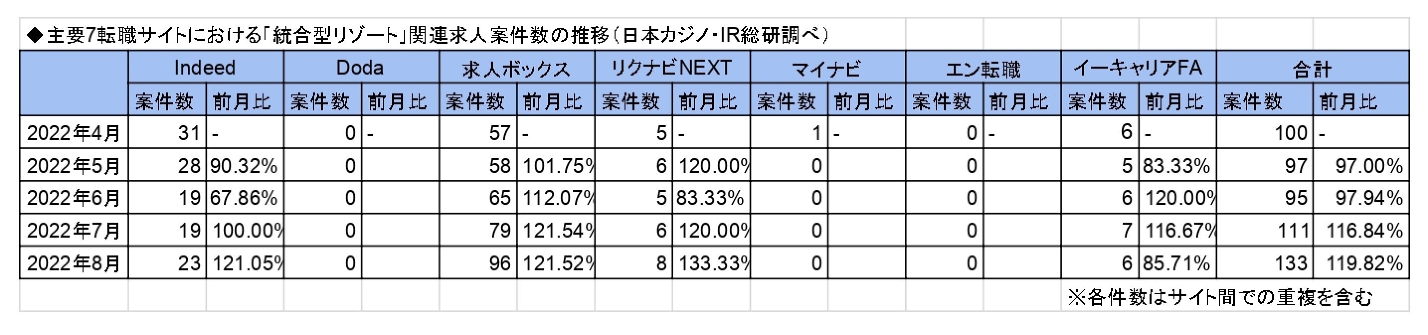 カジノIR業界専門ニュースメディア「日本カジノ・IR総研」は、主要となる7つの転職サイトにおける2022年8月時点の「カジノ」と「統合型リゾート」に関連する求人案件数をそれぞれまとめました。
