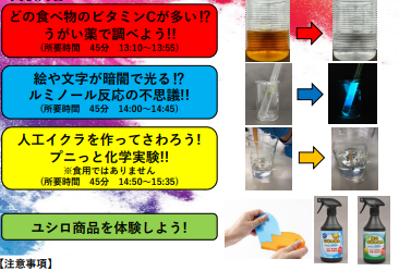 この度の「ユシロ化学ラボ」は,寒川地域の小学3年生~6年生を対象にした参加費無料の化学実験教室で、40名に参加していただきました。今回は、”目で見て分かる!!”をテーマに「ビタミンCの酸化還元反応」・「ルミノール反応」・「人工イクラの作製」の実験を行いました。