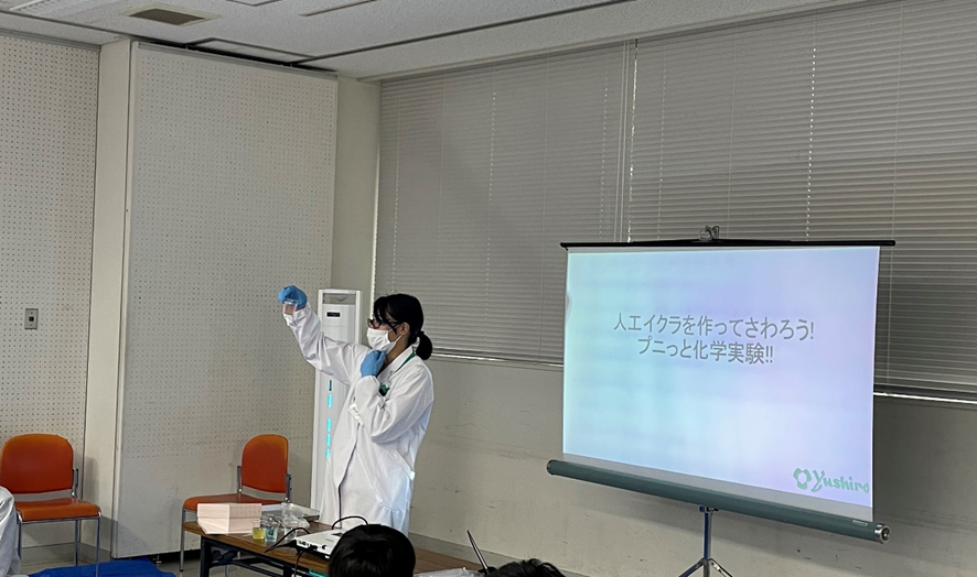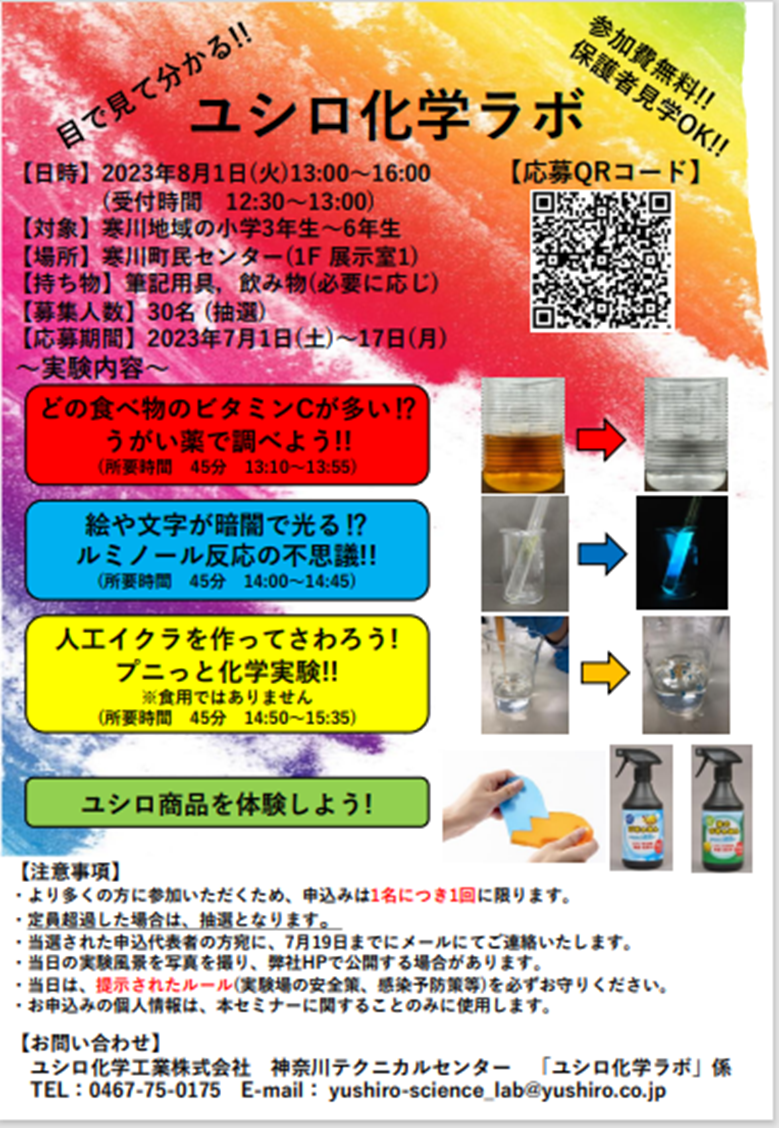 当社は神奈川県の寒川町に研究所を構えて約60年が経ち、僅かながらでもお世話になった地域に貢献ができないかという想いから,2023年8月1日に寒川町民センターにおいて小学生向けの化学実験教室「ユシロ化学ラボ」を実施いたしました。