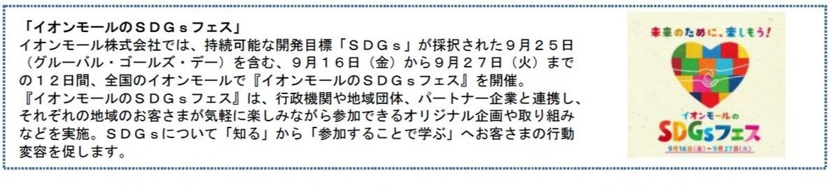 さらに期間中、「イオンモールのSDGsフェス」を同時開催。フードバンク常滑と協働で、常滑フードドライブを実施し、食品ロス削減に取り組みます。