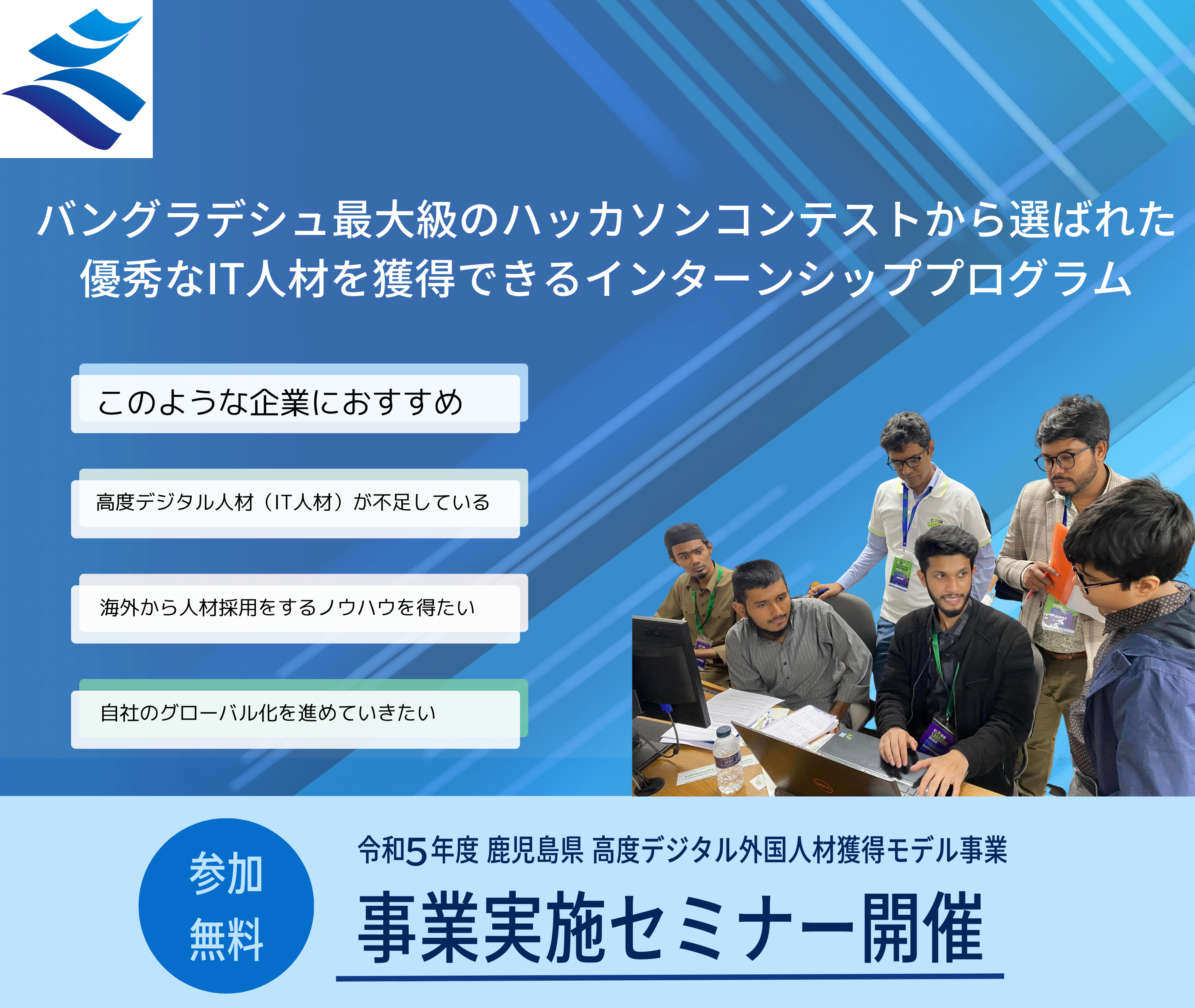 【鹿児島県内企業対象】バングラデシュ最大級のハッカソンコンテストから選ばれた優秀なIT人材を獲得できるインターンシッププログラム 事業実施セミナーを6/7(水)に開催