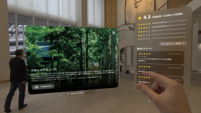 一部の観光地では、Vision Proならではの高精細で臨場感溢れるイマーシブなVR180の3D映像が目の前に広がり、まるで現地を訪れたかのような疑似訪問体験が可能です。