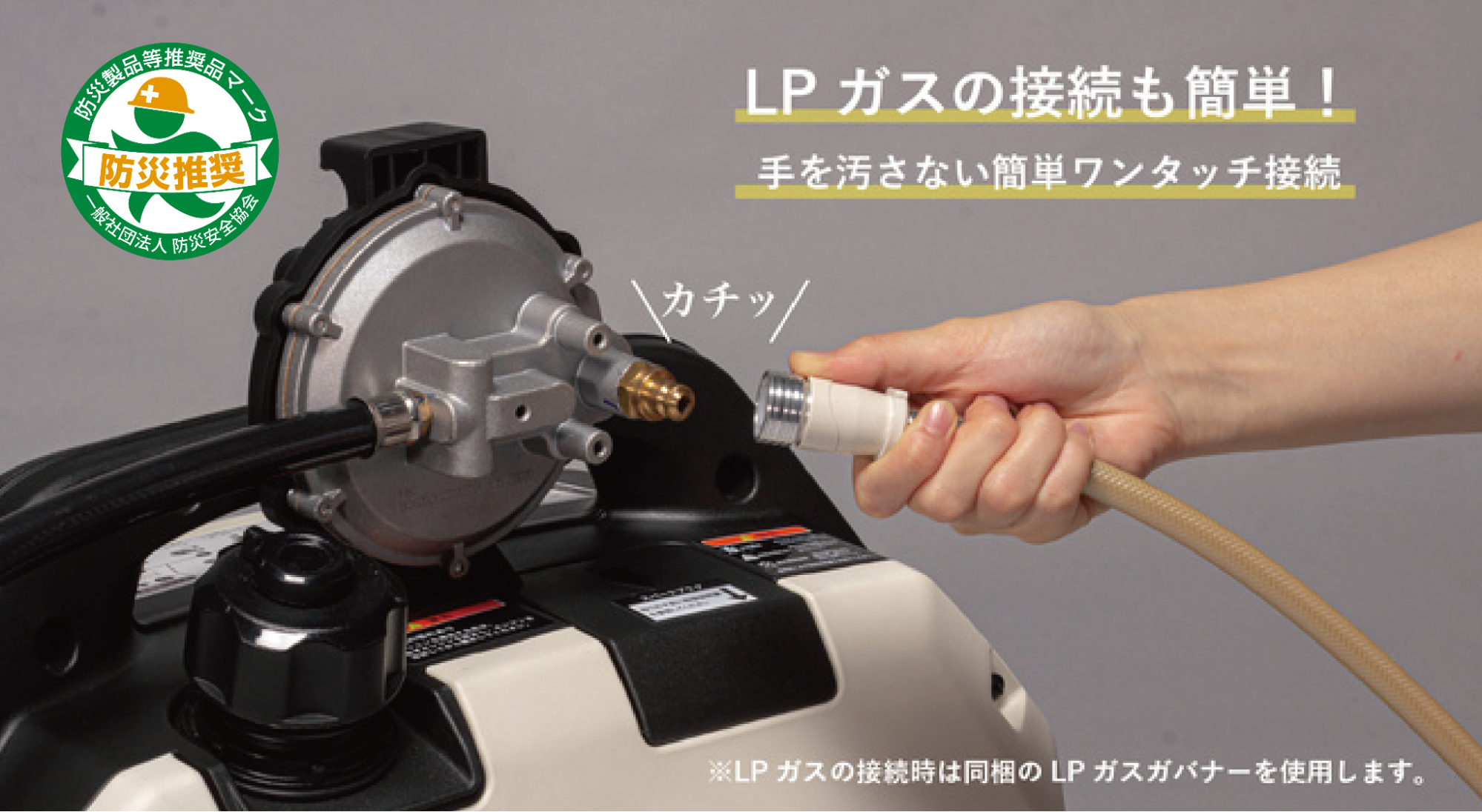【定格出力】 LPガス 1.53kVA / ガソリン 1.7kVA