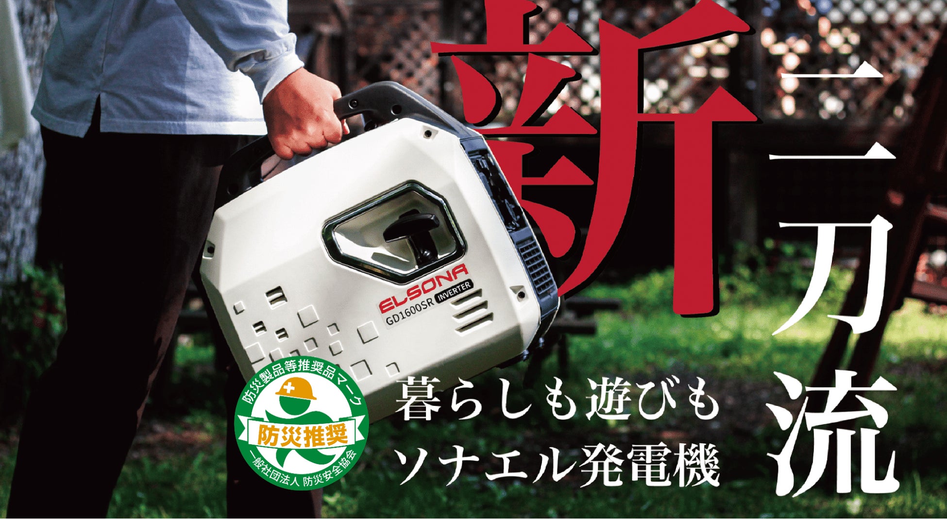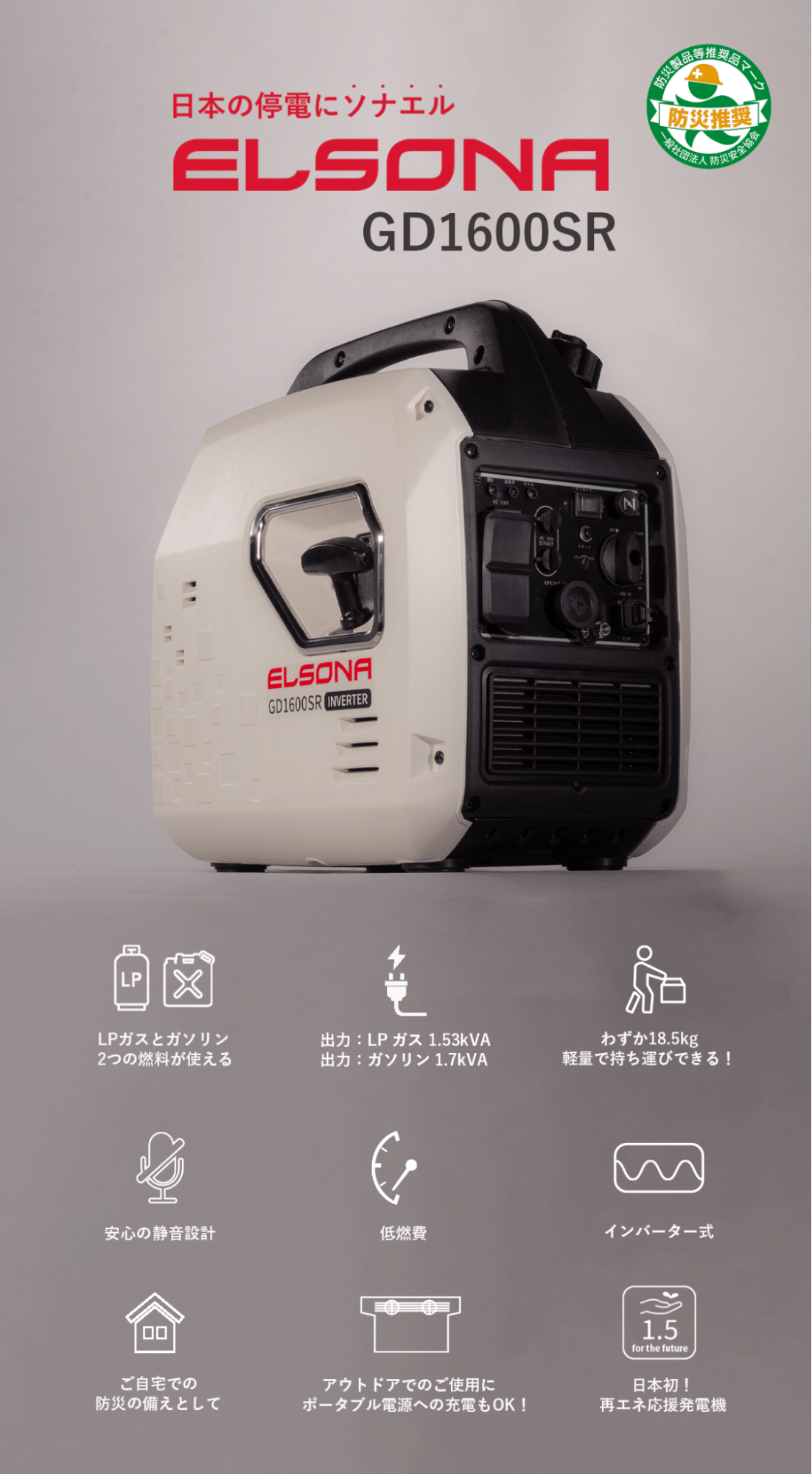 【10/13は国際防災の日】LPガス&ガソリン新・二刀流発電機 『ELSONA GD1600SR』が「防災製品等推奨品」の認証を取得したことをお知らせいたします!