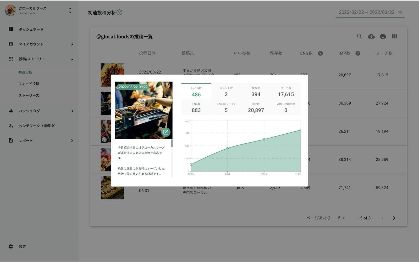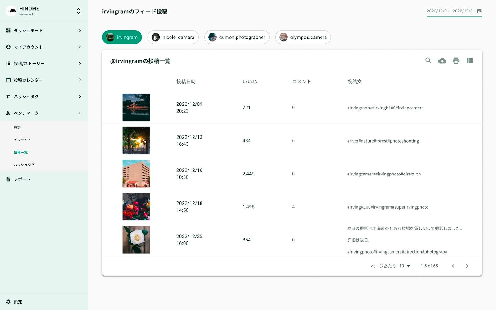 ご利用中のアカウントで設定したベンチマークアカウントの「インサイト」「投稿」「ハッシュタグ」を確認できる機能です。Instagram1アカウントにつき、最大5アカウントまでベンチマーク登録することが可能です。