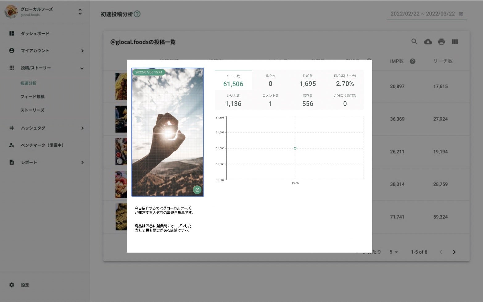 Instagramでは、「短時間にたくさんのエンゲージメント」がつくことが重要だと言われています。例えば、投稿してから24時間で100いいねがつくのではなく、1時間で100いいねがつくのが重要だと考えられています。その経過を目視でアナログに管理するのは困難なため、投稿の初速推移が計測できる機能を搭載いたしました。