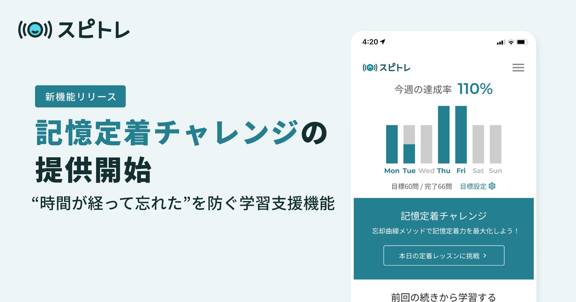 株式会社スピトレ(本社:東京都渋谷区、代表取締役社長 杉本 佳之、以下スピトレ)は、ビジネス英語の発話練習に特化したオンライン英語「スピトレ」にて「記憶定着チャレンジ」を提供開始いたしました。