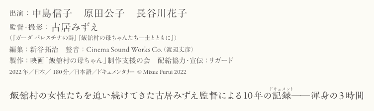 その強さと逞しさに惹かれたのはパレスチナの女性たちの取材を長年続けてきた古居みずえ監督。福島に拠点を構え、故郷、生業、家族のはざまで揺れる飯舘村の女性たちの心情を丁寧に記録。10年以上の撮影・制作期間を経て「第1章 故郷への想い」「第2章 べことともに」「第3章 帰村」の全3章・3時間に及ぶドキュメンタリーを完成させました。