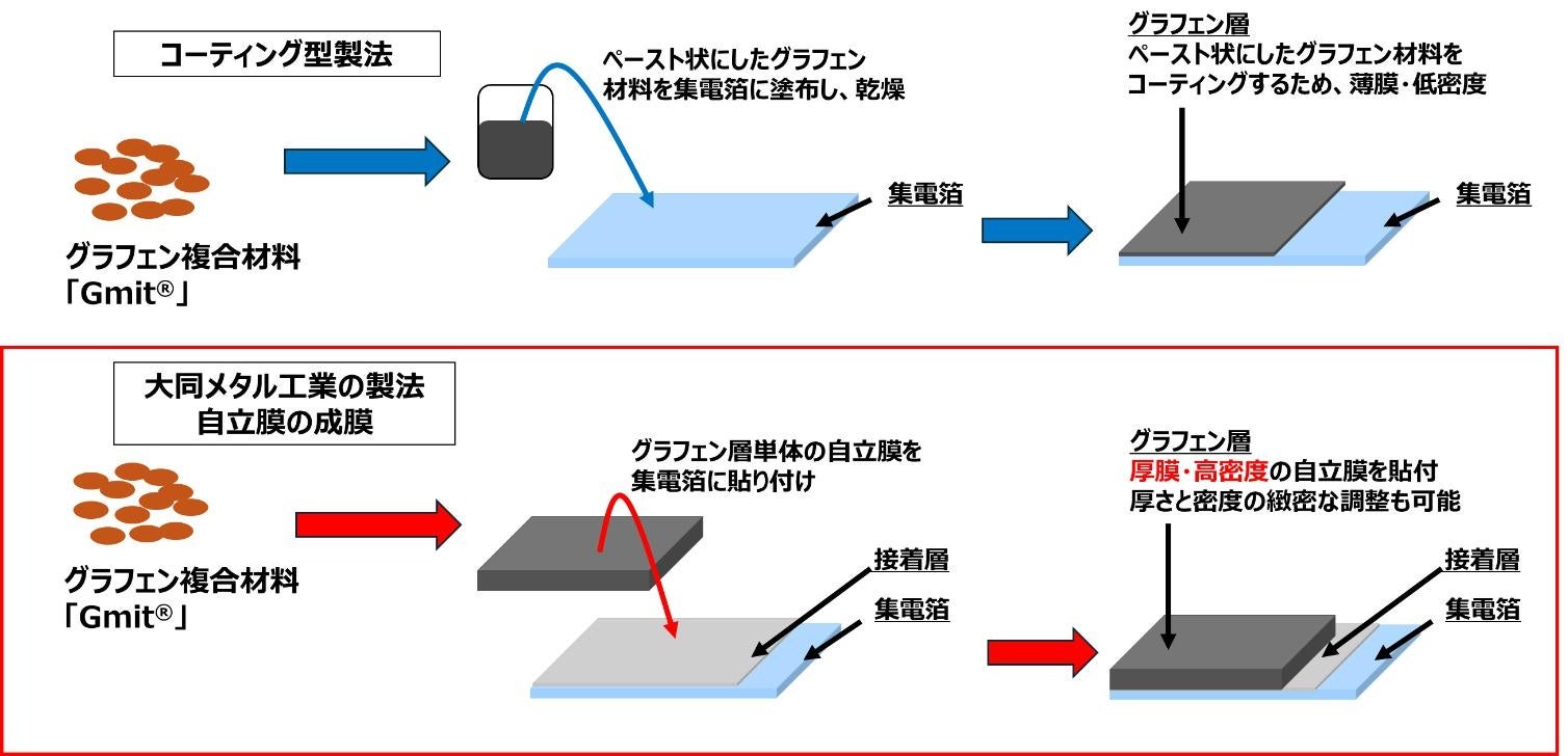 従来のグラフェン電極は集電箔にペースト状にしたグラフェン材料をコーティングしている為、厚膜電極(膜厚130μm以上)の生産は不可能でしたが、大同メタル工業株式会社は(株)マテリアルイノベーションつくばが開発した「Gmit®」の技術を用いたグラフェン複合材を用い、キャパシタ用電極シートの製造で培った製造工程に自社開発の成膜技術を加え、高密度(0.7~1 g/cm³)で、厚膜(膜厚130~250μm)のグラフェン厚膜電極の製造に成功しました。
