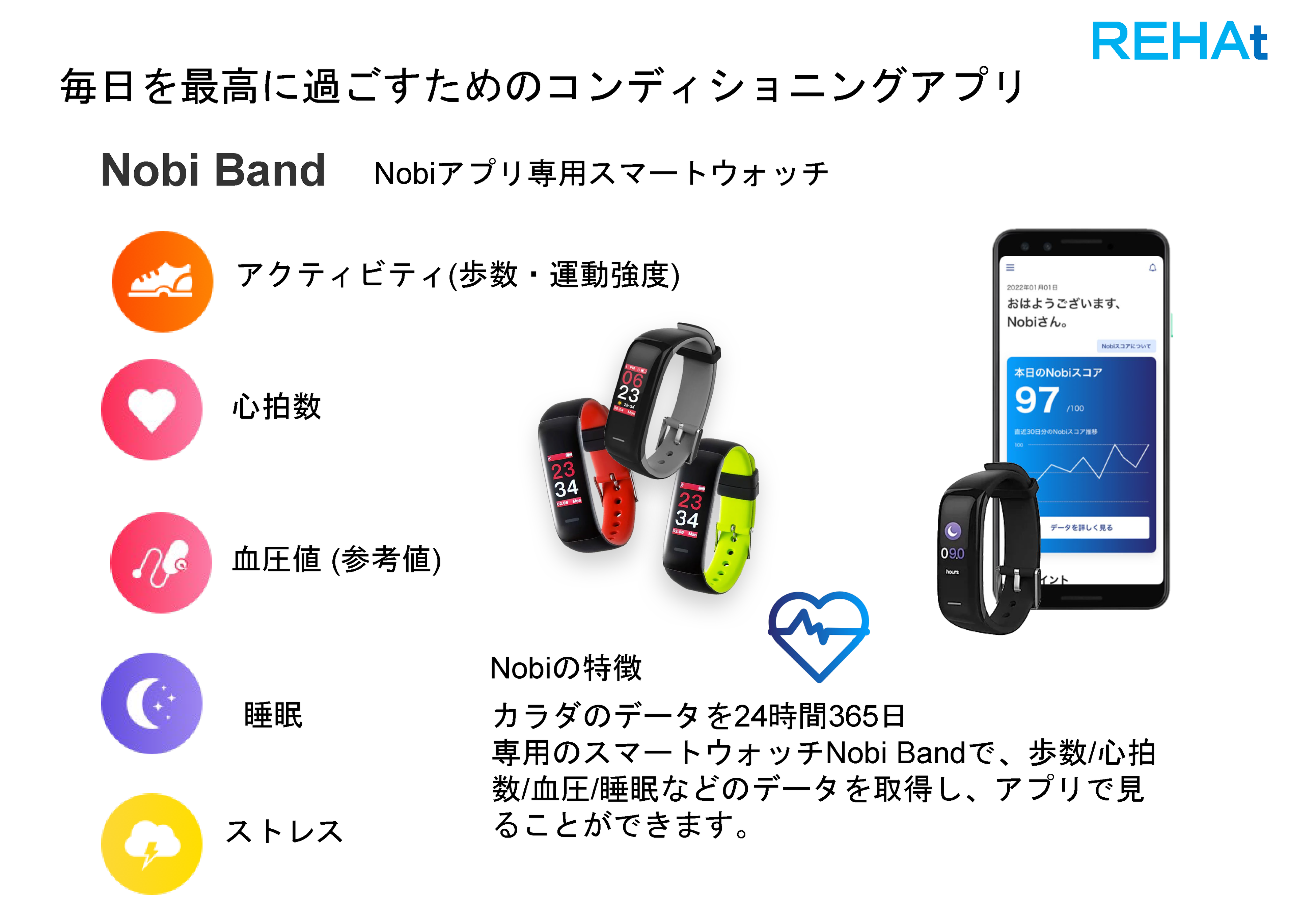 カラダのデータを24時間365日専用のスマートウォッチNobi Bandで、歩数/心拍数/血圧/睡眠などのデータを取得し、アプリで見ることができます。