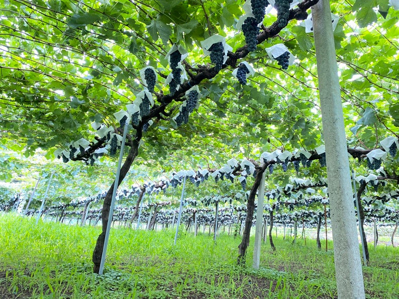 最も病害が怖い6月~7月は、雨が例年より少なく、日照時間に恵まれ健全なまま生育が進んでいましたが、8月に入ってからは長雨と低温が続き、天候不順に悩まされる毎日でした。この時期は、誘引、除葉、摘粒などの栽培管理とぶどうの生育との闘いの日々です。2021年は、自社畑のすべてのぶどう品種に傘紙をかけ、病害を防ぐ努力をいたしました。