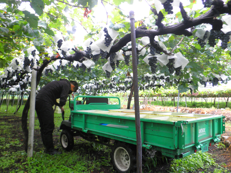 9月には、天候もある程度回復しましたが、前年に比べると降水量も多く裂果が心配されましたが、プチヴェルドの一部で裂果が見られました。8月の天候不順により心配された収穫量、糖度はある程度回復しましたが、酸度がなかなか下がりませんでした。自社農園の垣根仕立ての甲州に関しては、前年より糖度を上げ収穫することが出来ました。