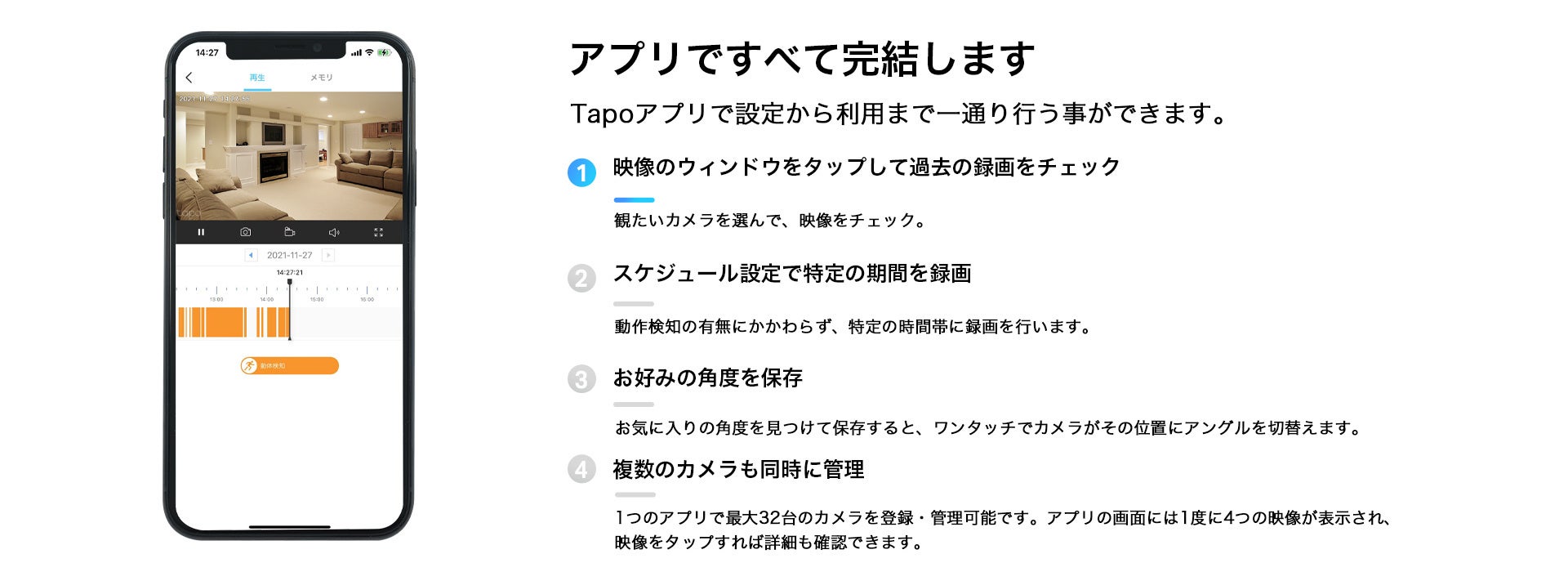 Tapoシリーズの製品は、専用の「Tapo」アプリから一括で管理することができます。カメラは最大32台の管理が可能で、1度に4台まで同時視聴できます。複数箇所にTapoカメラを設置して、お家を守りましょう。