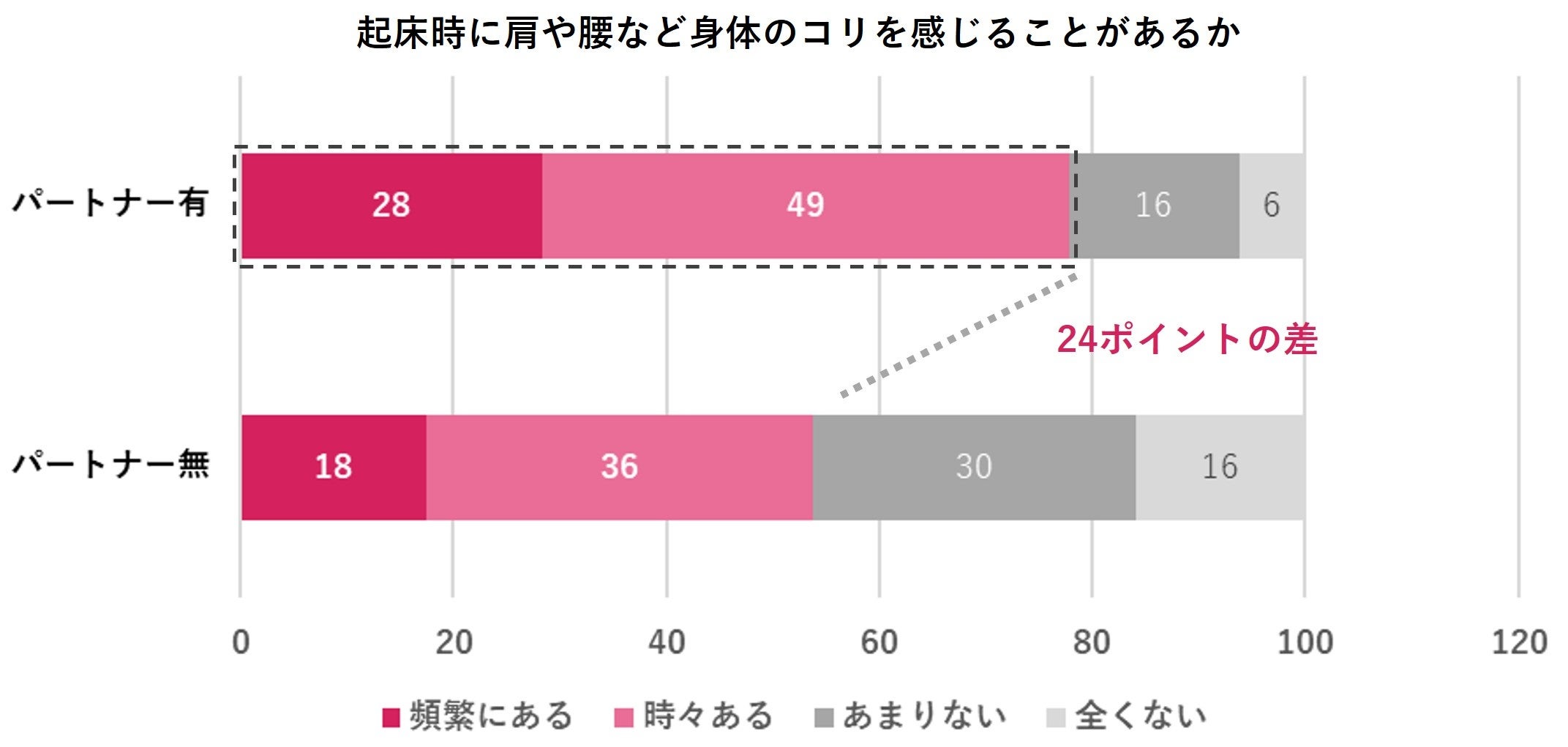 起床時に肩や腰など身体のコリを感じることがあるかどうかについては、前述した「健康」への自己認識と異なり、パートナー有の人の方が慢性的に不調を気にしている人が多いと判明しました。