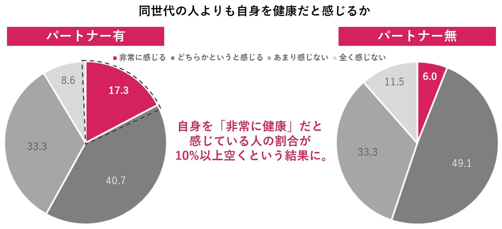特に、自身を健康だと強く感じている層の割合が大きく異なり、具体的には、パートナー有「非常に感じる(17.3%)」、パートナー無「非常に感じる(6.0%)」となっています。