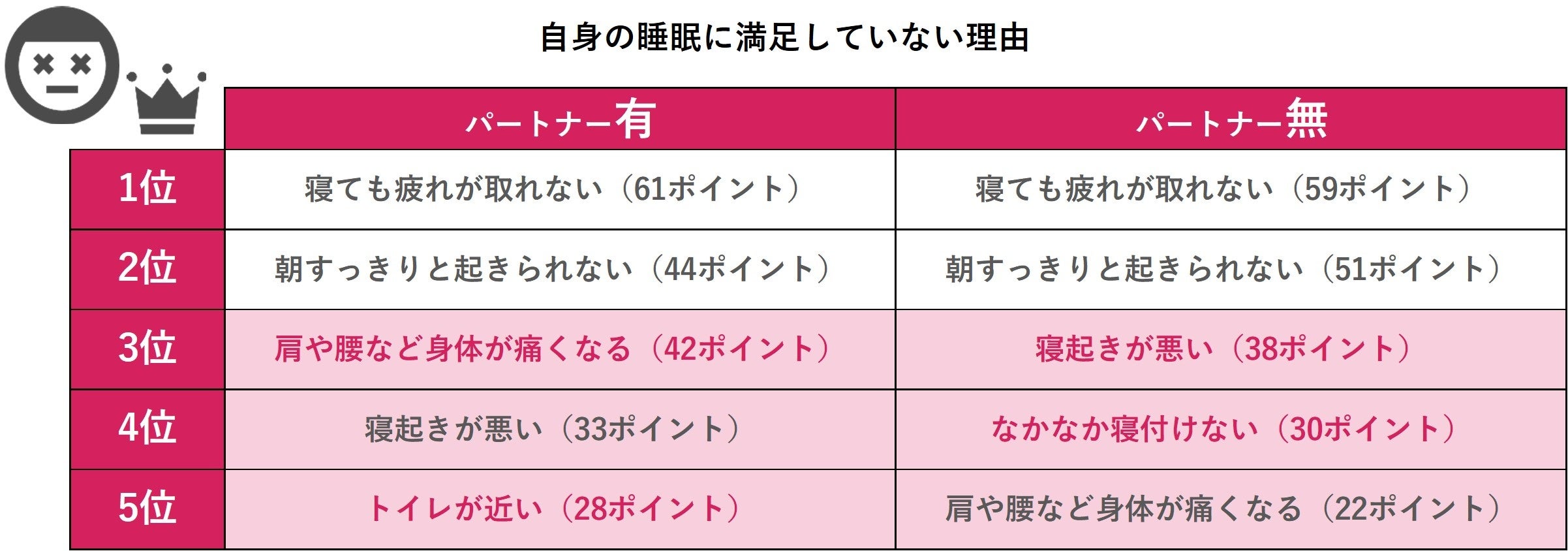 - ④パートナー有の人は、自分に合わない寝具で寝ている可能性が大?マットレスに満足できていない理由とは