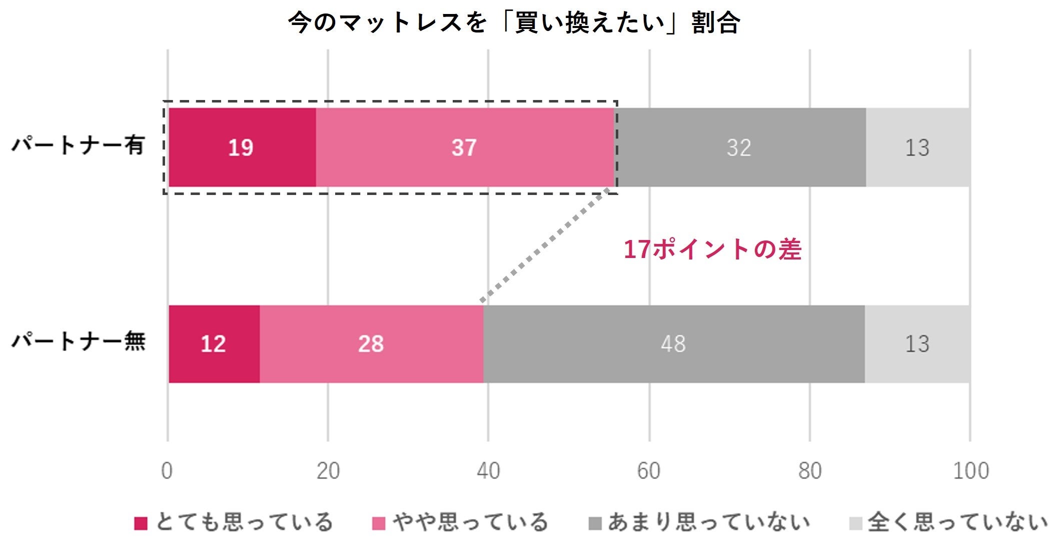 パートナー有の人は、自分以外の人の体形や体調に合わせて寝具を選んでいる可能性が高いことから、「買い替えニーズ」の高まりにつながっていると考えられます。