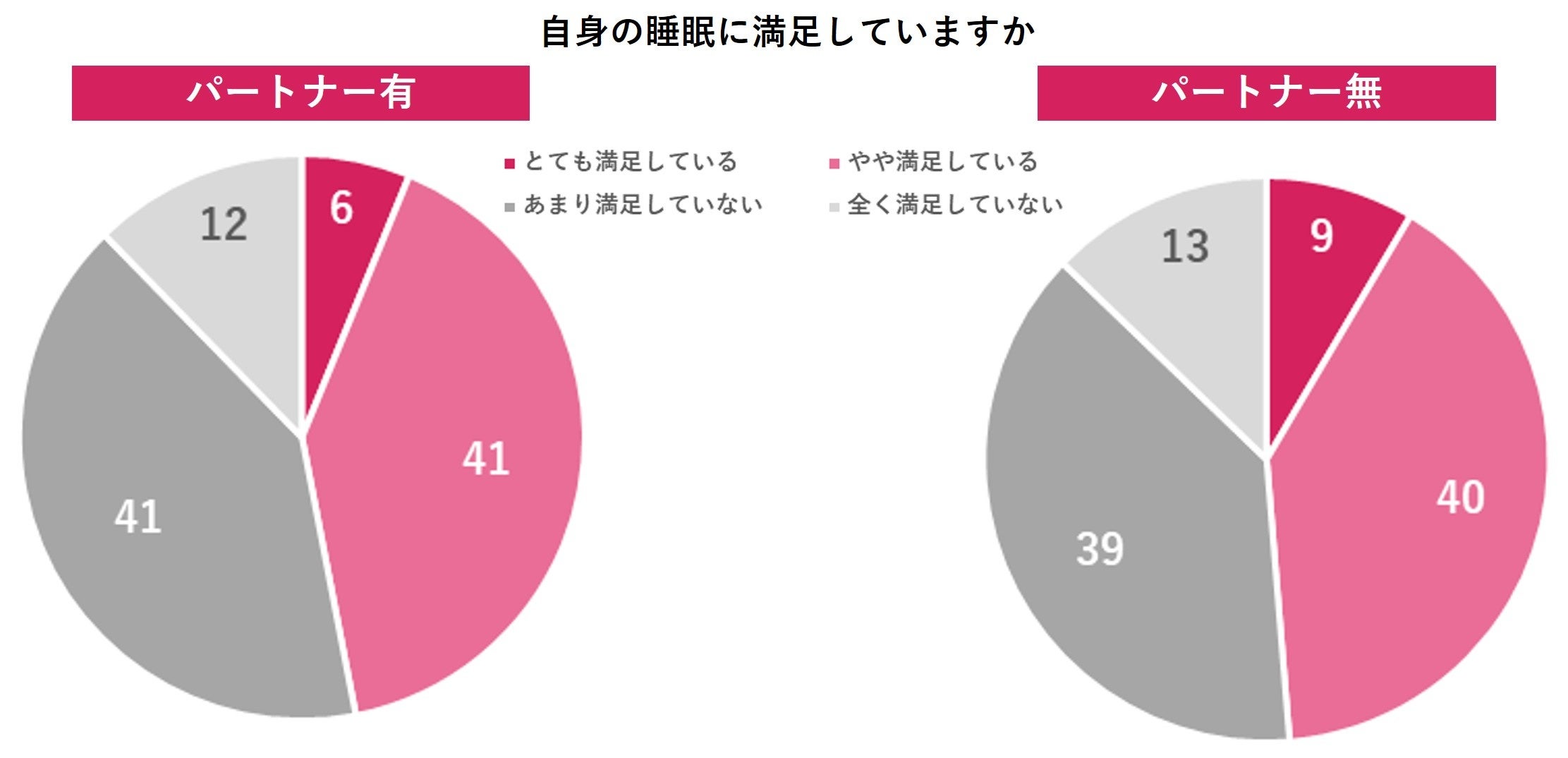 驚くべきことに、パートナーの有無によって体の不調や使用寝具の内訳など「睡眠事情」が大きく変わると判明しました。続いては、パートナー有の人を取りまく環境が、「睡眠への満足度」にどのようにかかわっているのか詳しく見ていきます。