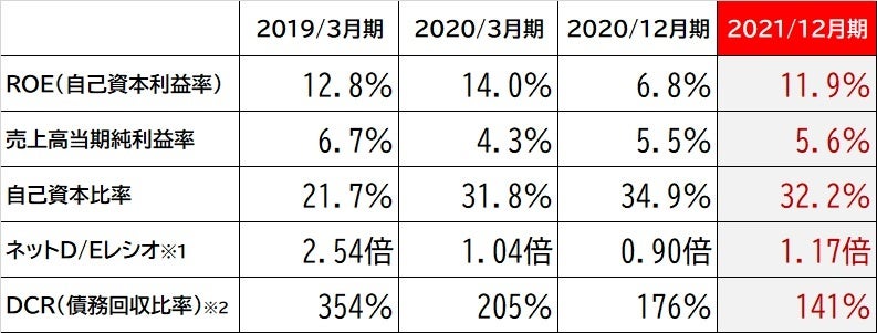 当社は重要な財務指標であるネットD/Eレシオ(※1)やDCR(※2)を大幅に改善させており、今後も一定の範囲内でコントロールしながら健全な財務基盤を維持します。