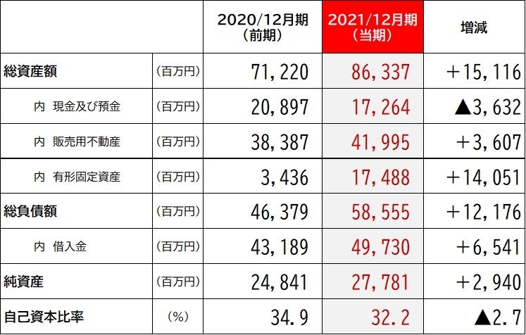 当連結会計年度末における総資産は、前連結会計年度末に比べ15,116百万円増加の86,337百万円となりました。順調に仕入れを行い、保有する販売用不動産の残高が3,607百万円増加し、長期賃貸事業を推し進めるべく有形固定資産(土地)を新規取得したことなどから14,051百万円増加したこと等によります。