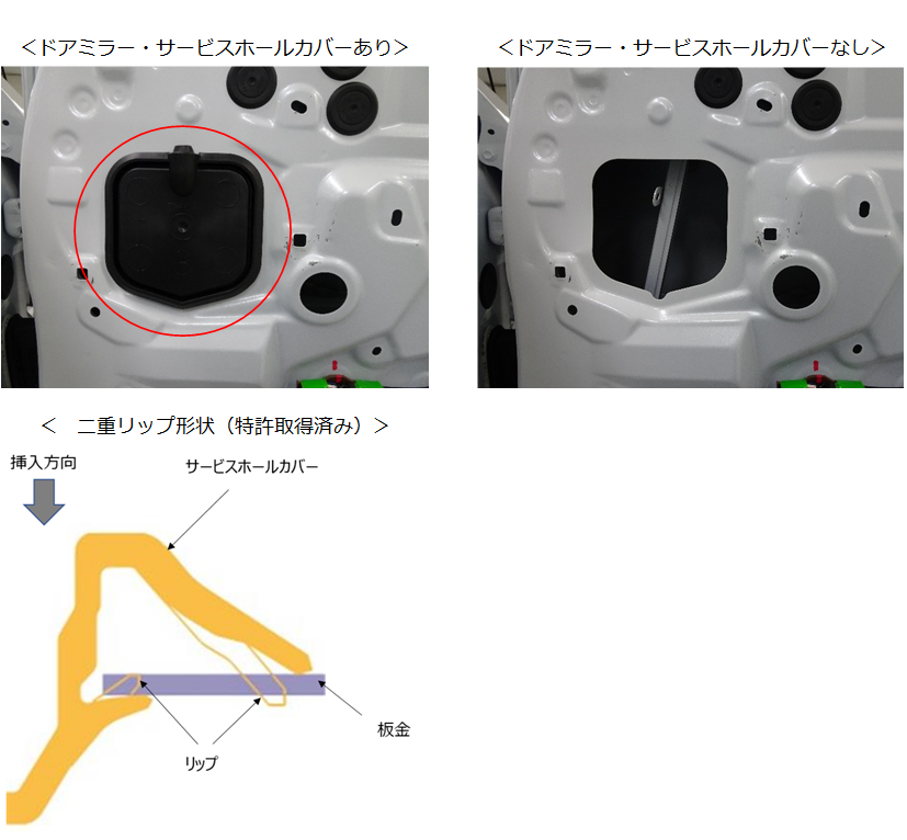 これら全てのニーズに対応し、このたび、ニフコでは、ドアミラー・サービスホール(ドアミラーの車体組付け時に必要となる作業用孔)を閉塞する、樹脂製ドアミラー・サービスホールカバーを、リサイクルが容易な材料と構造を使って商品化いたしました。