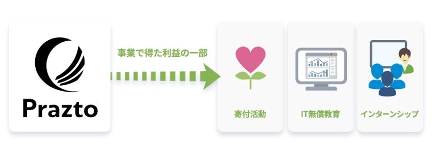 Praztoは「エンジニアリングの力でどんな可能性も諦めない社会を創造する」をビジョンに、SalesforceやTableauの導入事業と、IT無償教育の事業を行っております。現在は、SaaS導入支援事業で得た収益の一部を使用して、遺児の支援事業への寄付およびIT無償教育事業と学生のインターンシップを通じた学びの場の構築を行っております。