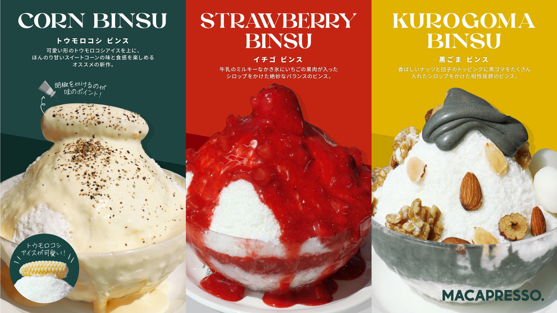 今年の夏、絶対食べておきたい!マカプレッソは韓国かき氷(ビンス)「トウモロコシビンス」、「イチゴビンス」、「黒ごまビンス」の三つの味で展開しております。