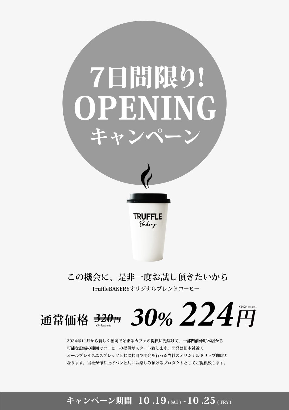 OPEN記念としてTruffleBAKERYオリジナルブレンドコーヒーを30%offでご提供!!【期間:10月19日(土)~10月25日(金)】