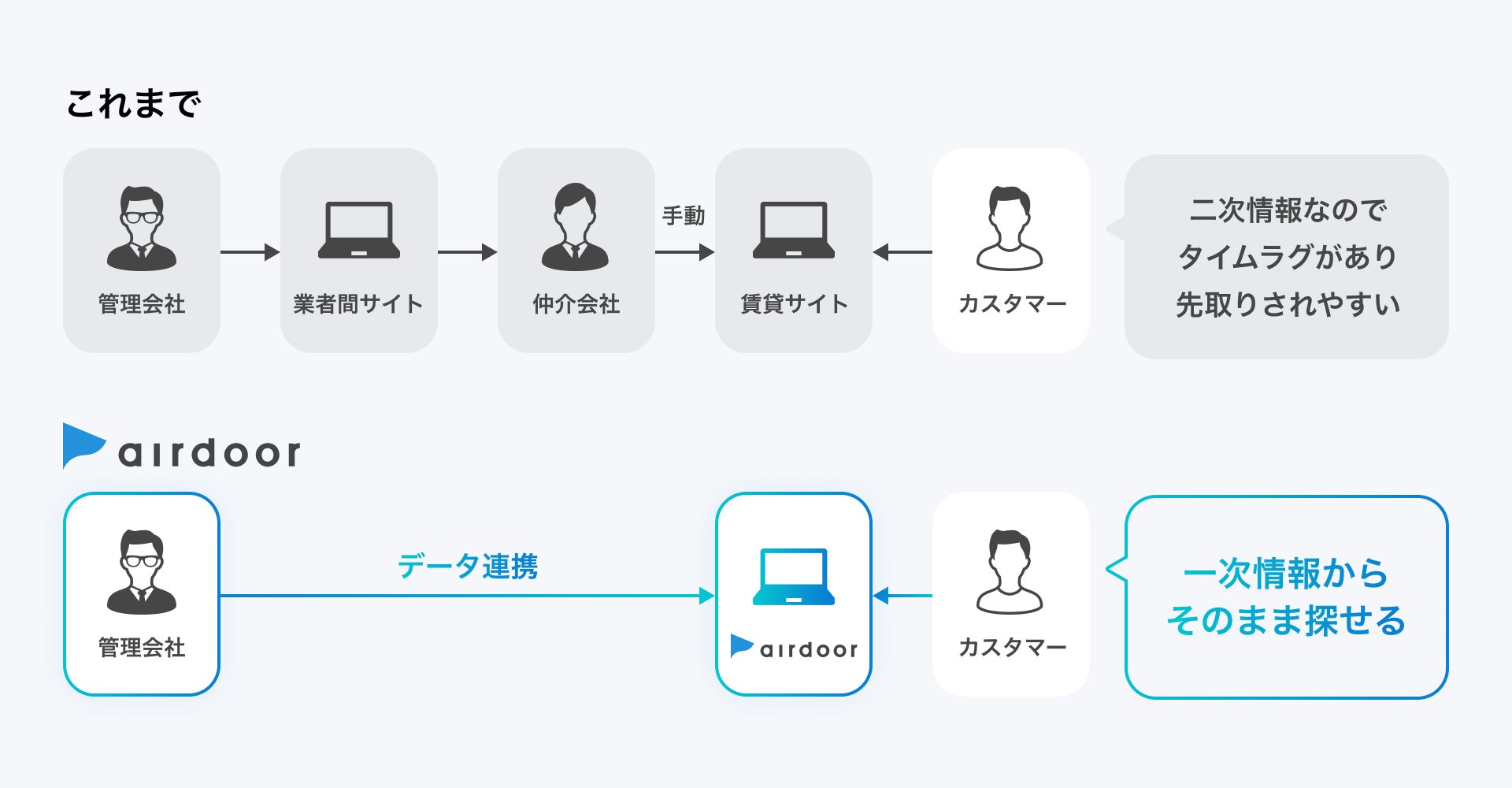 従来の賃貸サイトでは、管理会社が業者間サイトに掲載する情報と、仲介会社が使用するシステムが分断されており、仲介会社による物件情報の手動更新が一般的でした。しかし、エアドアでは管理会社のシステムと直接データ連携することで、カスタマーに一次情報を提供する仕組みを実現しています。