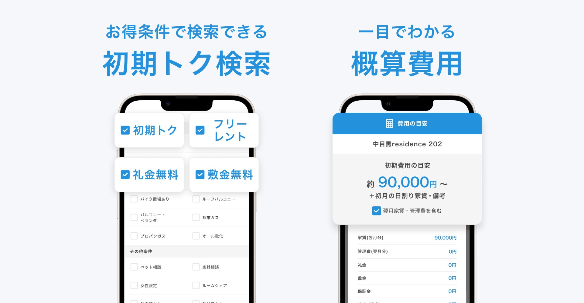 初期費用のお得度で検索できる「初期トク検索」に加え、通常問い合わせ後にしか確認できない初期費用も掲載。カスタマーの予算に合わせた最適な物件選びをサポートします。
