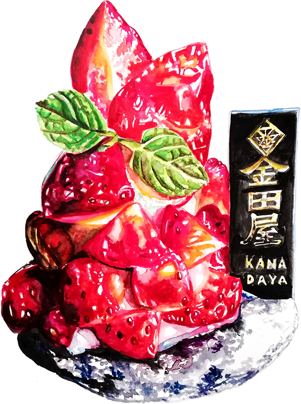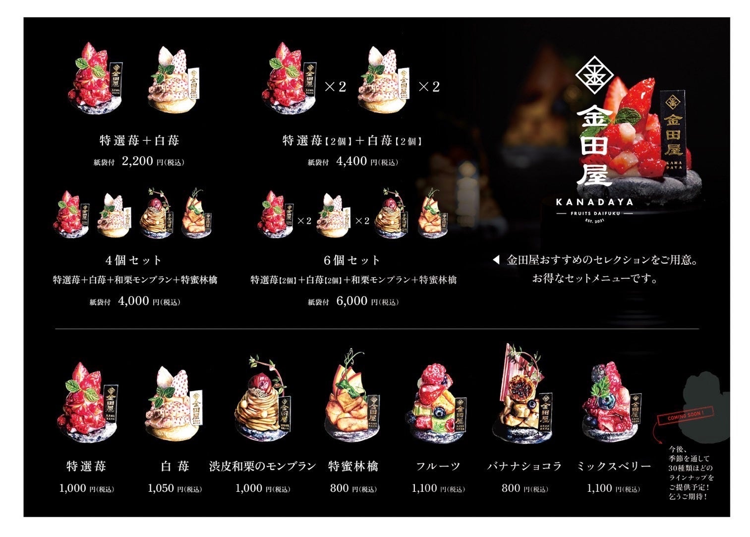 金田屋は、従来のフルーツ丸ごと白餡と餅で包んだ大福とは異なり、大福を平たく伸ばした上にフルーツを飾り付ける、いわゆる『デコレーションするフルーツ大福』。