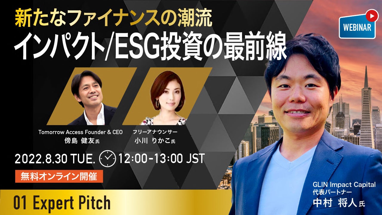 日本とシリコンバレーを繫ぐコンサルティング会社 Tomorrow Access LLC(本社:米国カリフォルニア、Founder & CEO:傍島 健友)は、「インパクト投資/ESG投資の最前線 〜新たなファイナンスの潮流〜」をテーマにした無料オンラインウェビナー「01 Expert Pitch #14」を開催します。