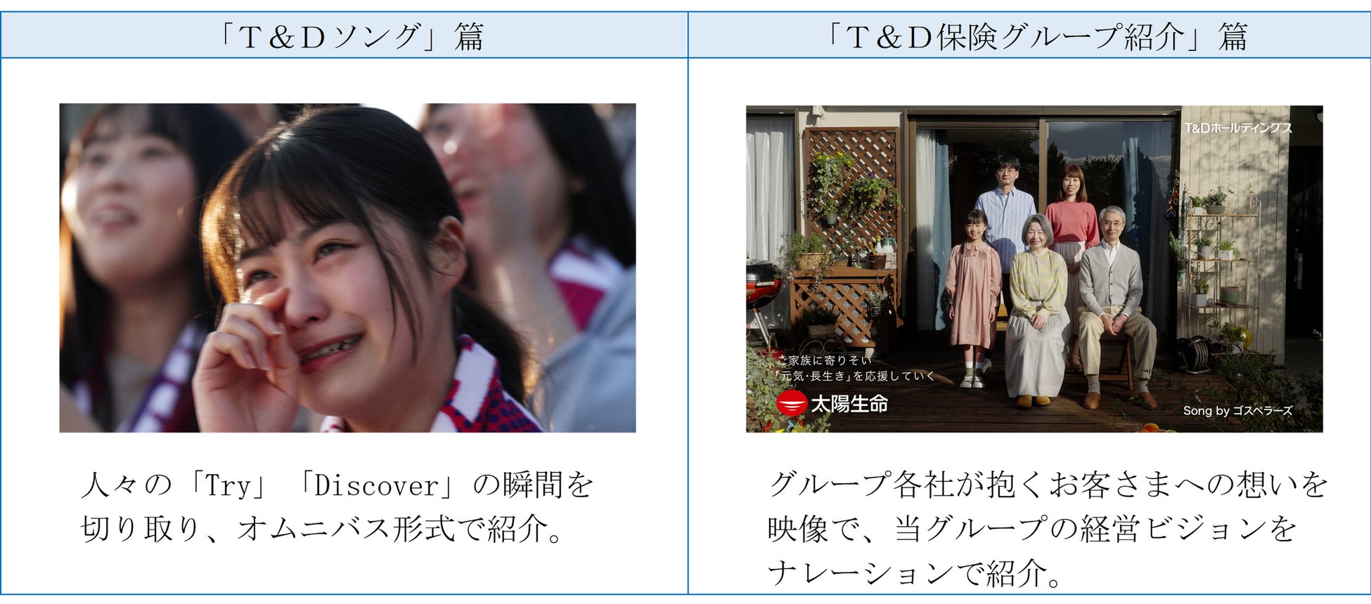 このたび、当グループの理念・経営ビジョンを表現した、グループ初となるCM「T&Dソング」篇(30秒・15秒)、「T&D保険グループ紹介」(30秒)篇を制作し、2023年4月3日(月)より全国で放映することを決定いたしました。