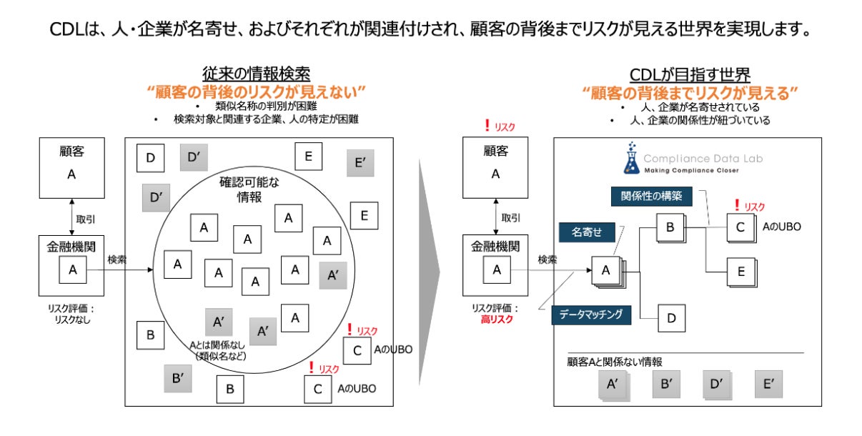 CDLは、情報ソースの拡充に加え、従来の情報検索において、類似名の判別が困難である、検索対象と関連する企業や人の特定が困難である、といった「顧客の背後のリスクが見えない」という課題を解決し、膨大なデータの中で、人・企業が関連付けされ、「顧客の背後までリスクが見える世界」を実現します。