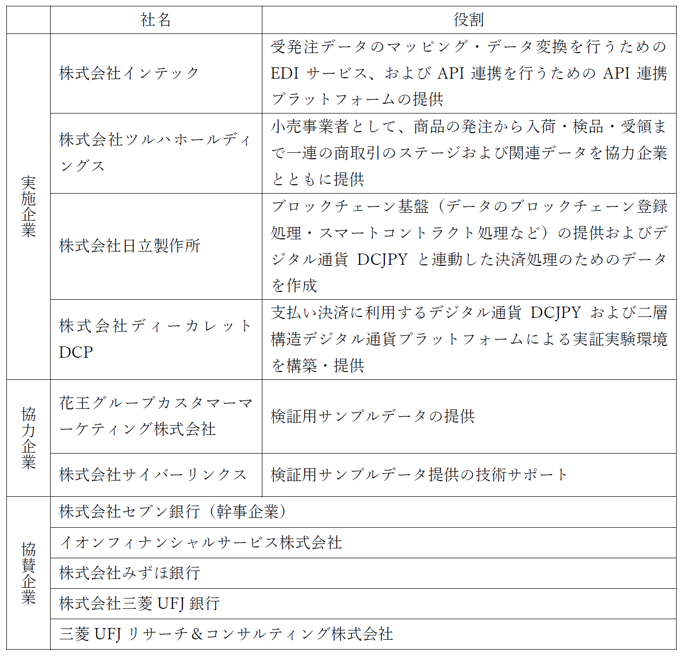 本実証実験は、商取引のデジタル完結による業務効率の効果を定量的に検証するとともに、連携環境を構築・活用する上での技術的な知見を蓄積することを狙いとして実施するもので、商流から金流への流れを自動化するデジタル通貨の有用性の確認や、その基本機能の検証、技術的課題の整理などを行います。
