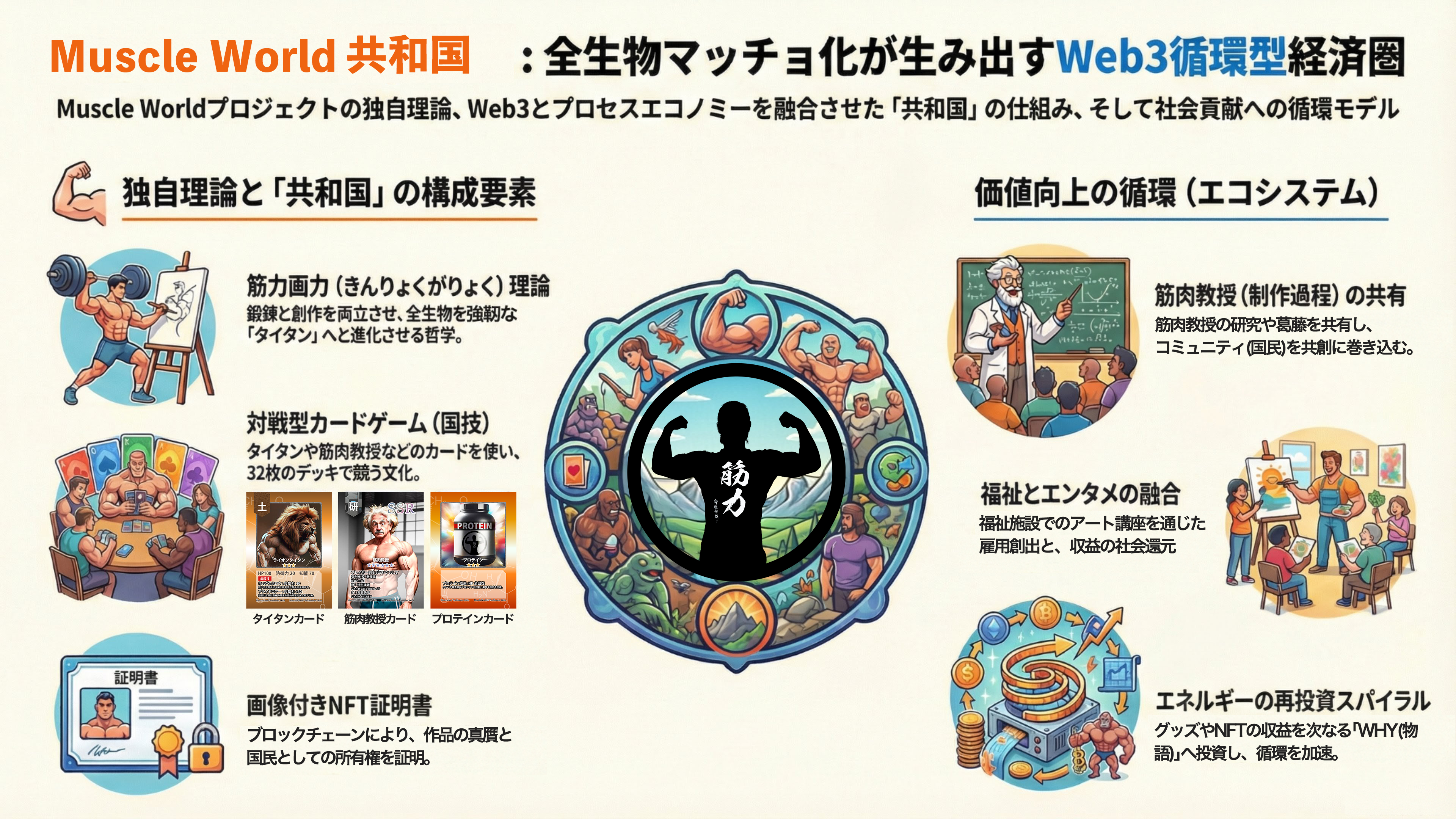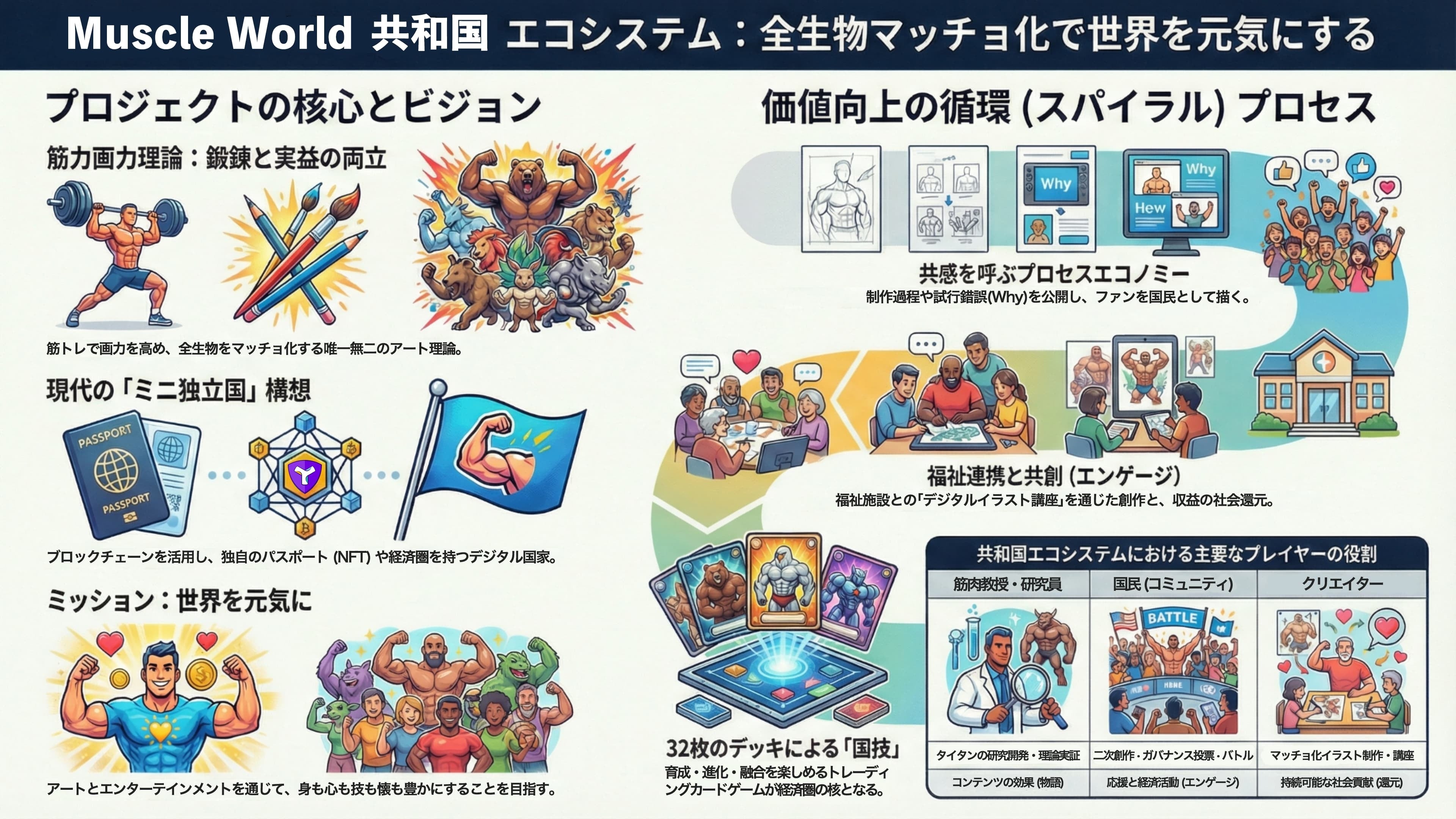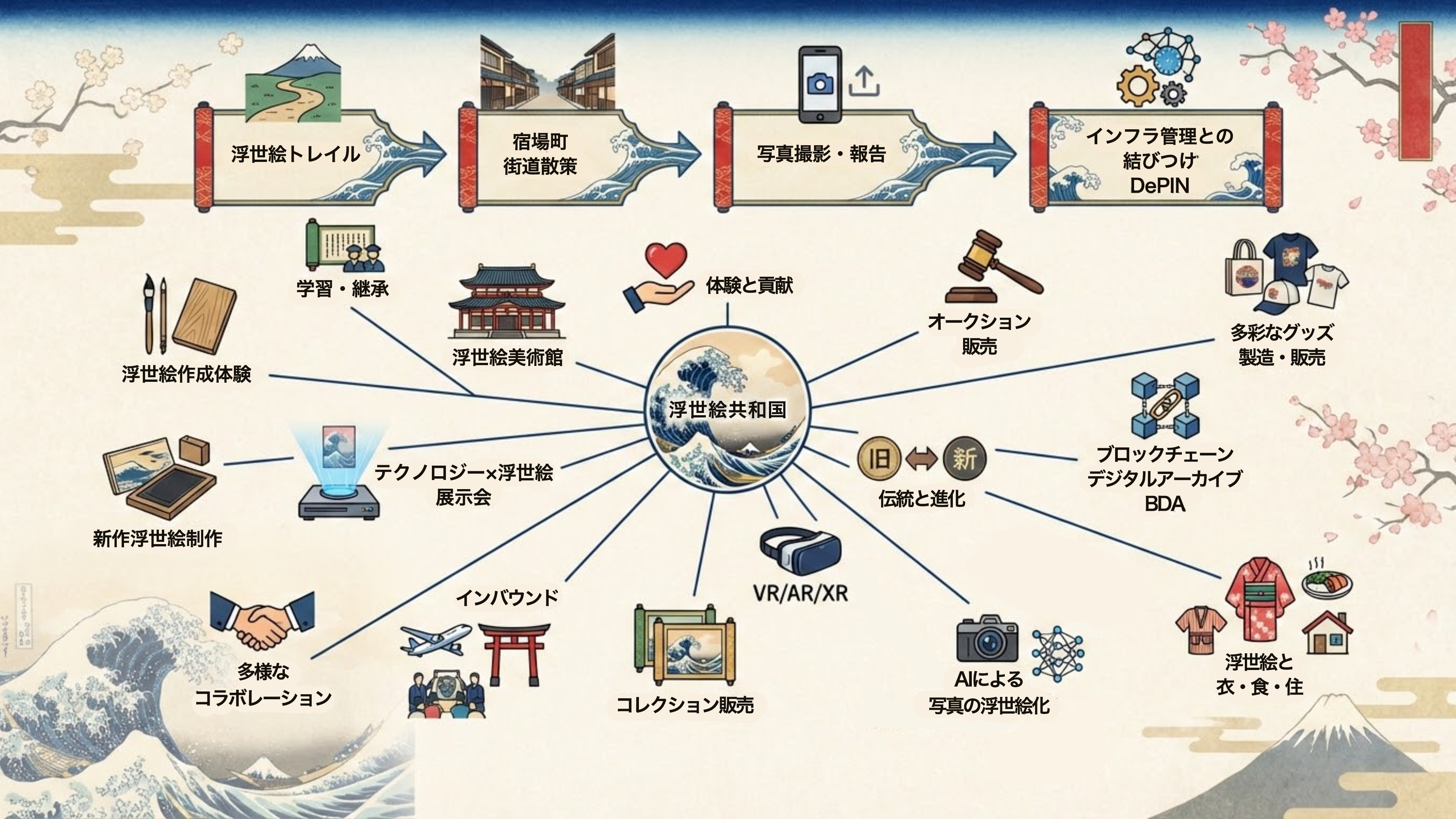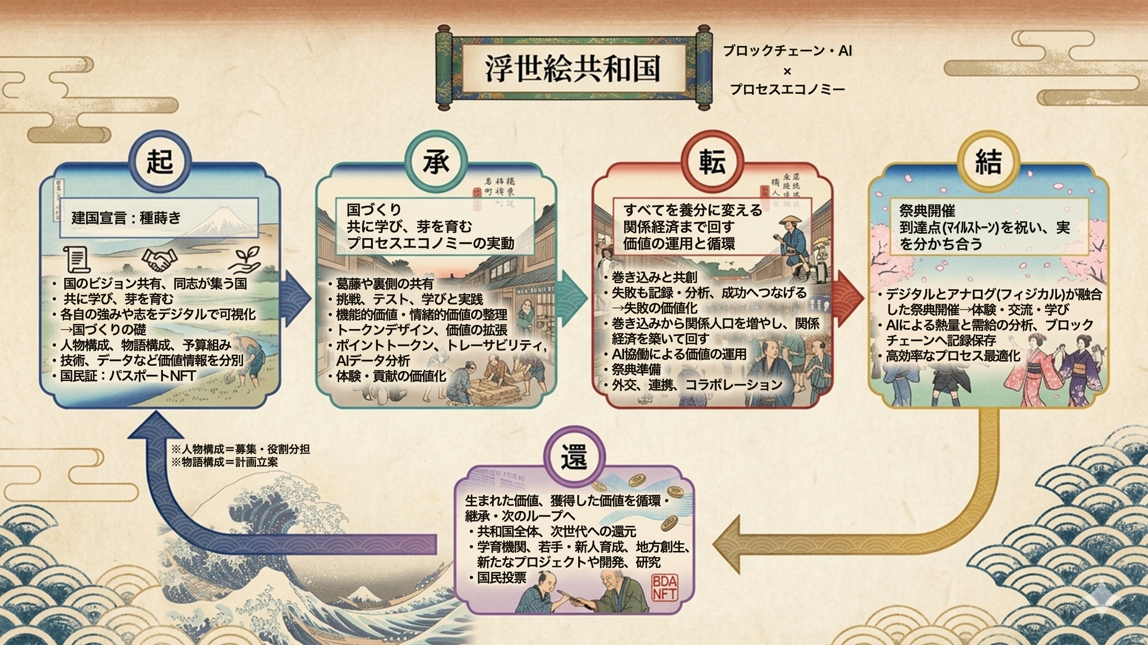「ミニ共和国物語」は、この精神を現代の先端テクノロジーでアップデートしたものです。自律分散型のブロックチェーンとAIを基盤に据え、完成品だけではなく、そこに至るまでの「試行錯誤の物語(プロセス)」をも資産ととらえ価値化して運用し、次世代へつないでまいります。